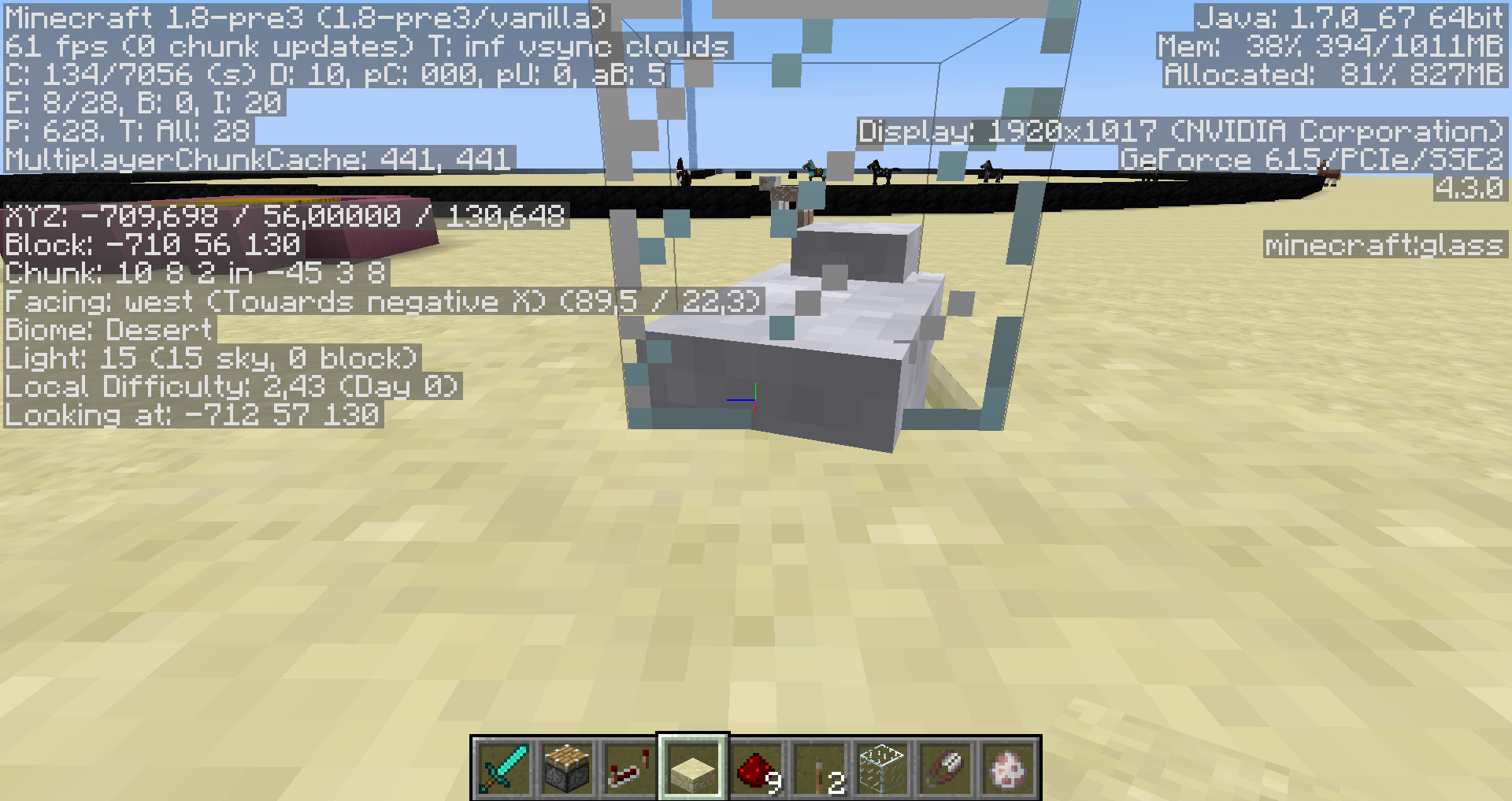Prior to 1.8 prelease I was able to interact with mobs "sealed" in a glass from all directions (north, south, east, west). In current snapshot, it is possible only from two (east and south). There might be more broader bug connected to that. Providing pictures for better reference (right side of the F3 screen shows which block Iam pointing to - minecraft:glass - in case of sheep there is none.)