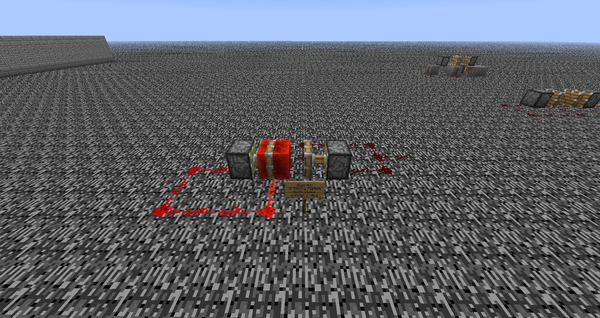 A few variations possible of the bug, using both the redstone block and any block with a redstone torch below, depending on if only one piston is sticky or if both are, there are two differences.
