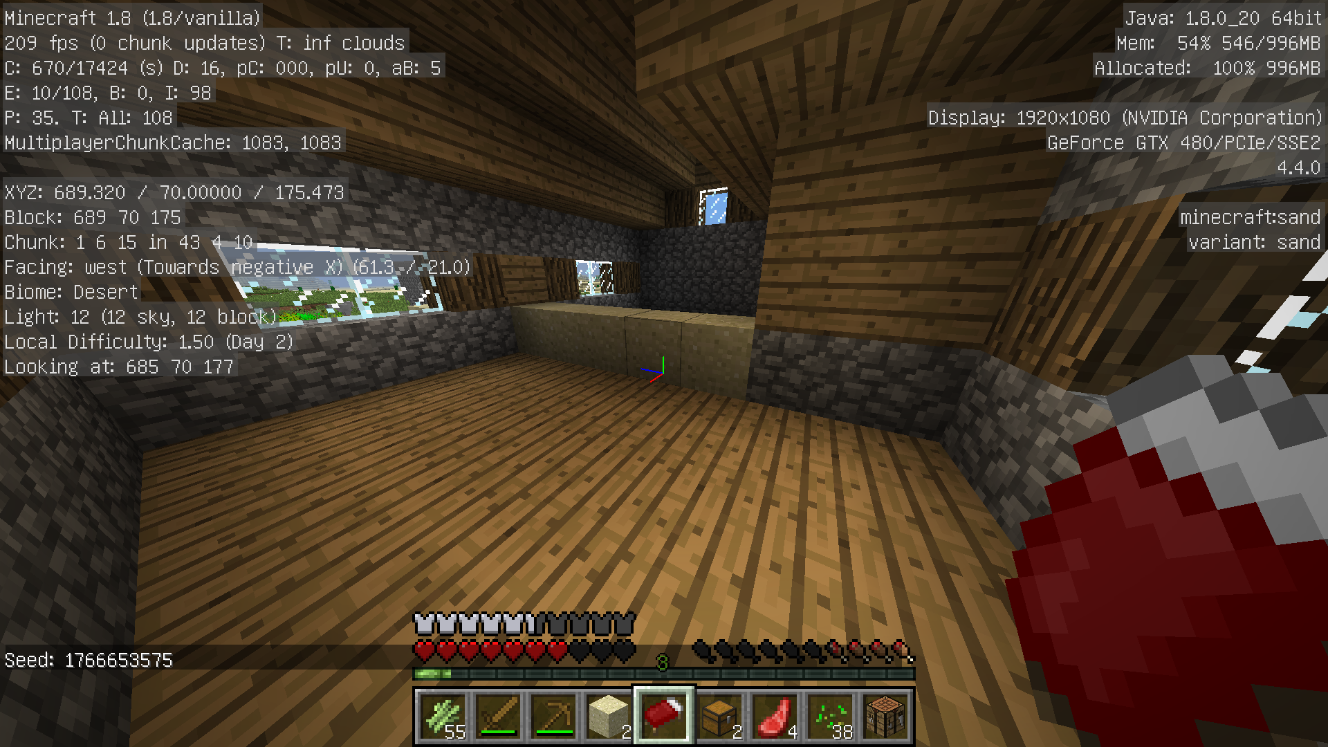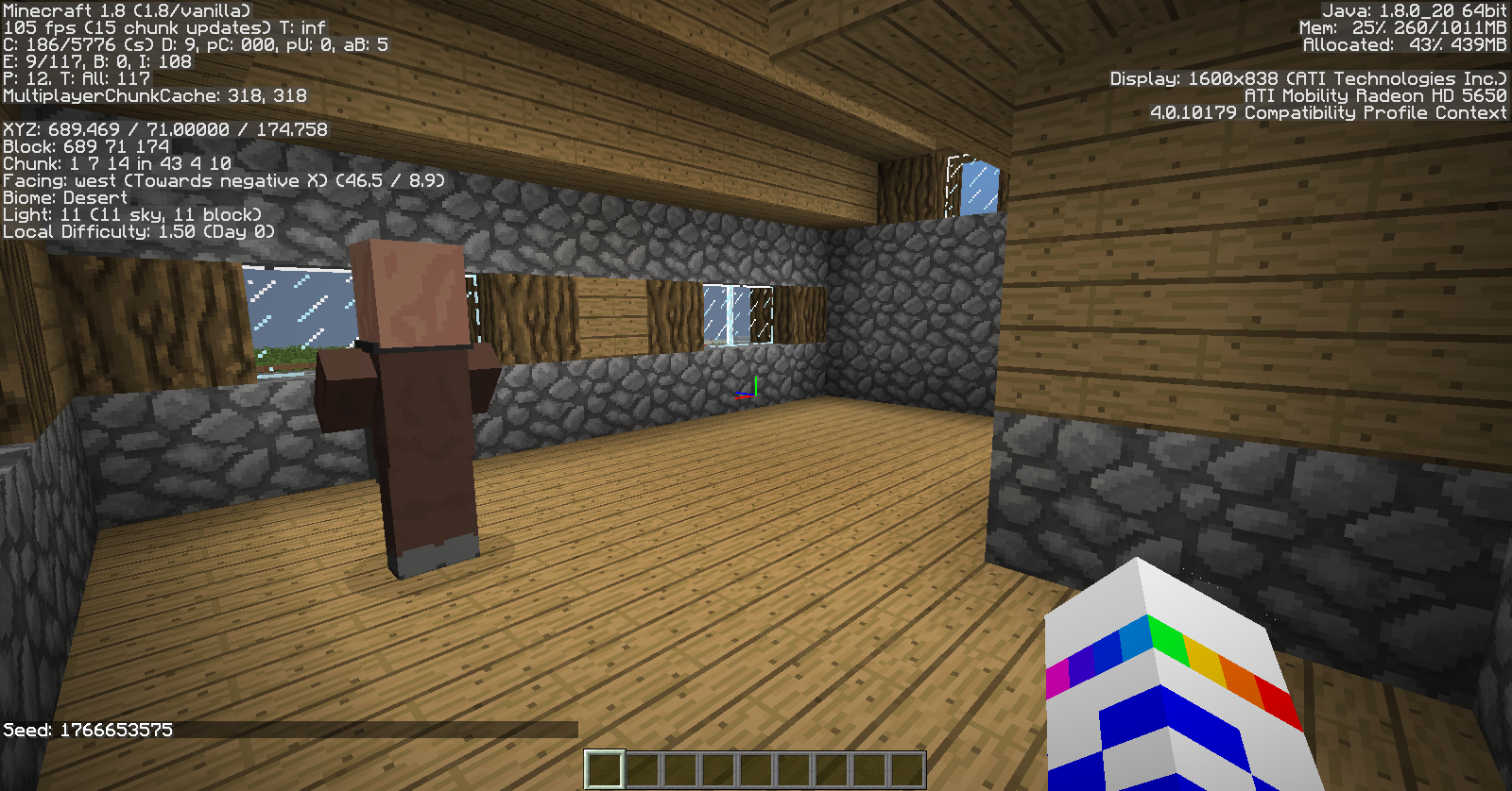 This screenshot shows an extraneous line of sand that generated on a house's floor, along the border where the village crosses into a desert biome.