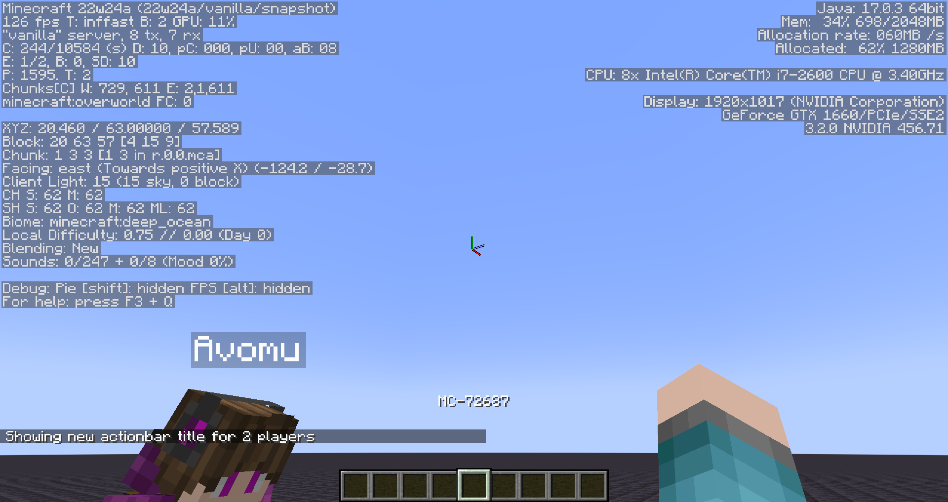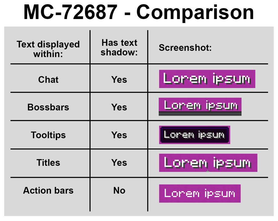 /title @a actionbar {"text":"MC-72687","color":"white"}Take note as to whether or not there are any shadows on text displayed within the action bar.