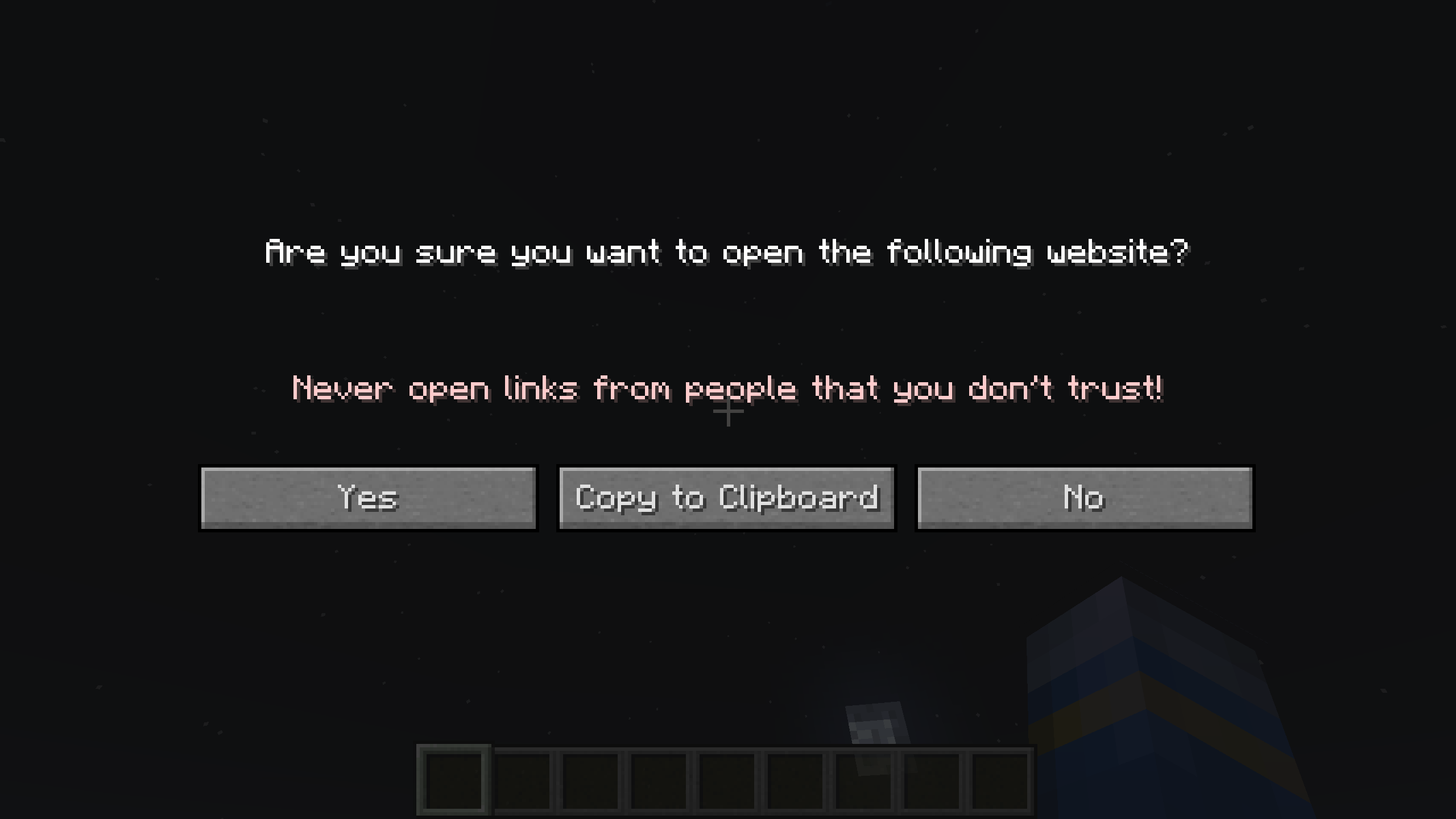 /tellraw @a {text:"",extra:[{text:Clicky!,clickEvent:{action:open_url,value:"http://google.com/"}}]}The resulting popup will not display the URL you would be taken to. See attached screenshot.