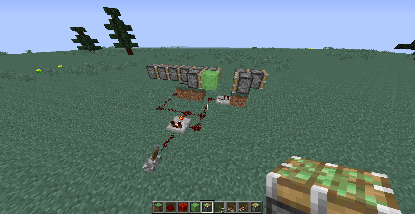 3.Connect it with 2 sticky pistons one block above ground and put a slime block between the pistons.