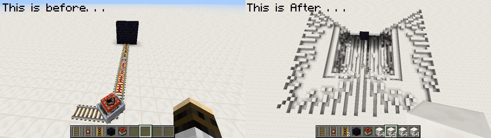 If you place 3 regular rails in a straight line, and then place a detector rail facing a different direction so that it connects to the 3rd rail and turns. Then 4 powered rails, but not powered, then another dectector, than another 4 powered rails but not powered and then a 3 by 3 wall of obsidian stopping the end of the rails. Do this on a flat map preferably and warning it crashes or severely lags out your game. Then go to where the track turns on the regular rail. Place a minecart with TNT in it and then look at the rail on the bottom and place another. This should place 2 but only look like 1 minecart with tnt in it. Then push both of them with your player and when they hit the obsidian it may take a few seconds but it will create a Massive nuke affect that doesn't destroy any blocks and looks like a square with patterns in it similar to other nuke mods out there. This is a fresh vanilla minecraft. there are some videos on youtube about it. THIS BELOW IS THE CRASH ERROR I GOT, IM RUNNING WINDOWS 8 ON A NEWER COMPUTER. DELL.