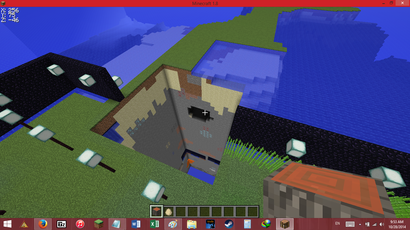 When I opened the world I have been working on for the past month, the world first opened up to black. Usually it loads after a while, but this time it didn't load at all. Since had cheats on anyway, I tried teleporting, then going high to kill myself, and eventually I just used the "/kill" command to sepuku my character. When I respawned, the world was back except for a giant hole where I had just been. The hole goes all the way up and down, and it won't let me enter that area. I also tried accessing the area through the top and it won't let me.