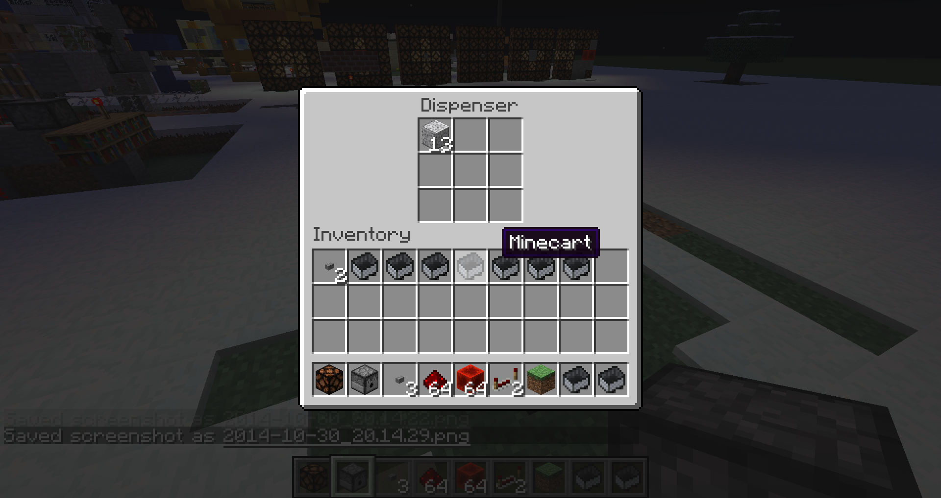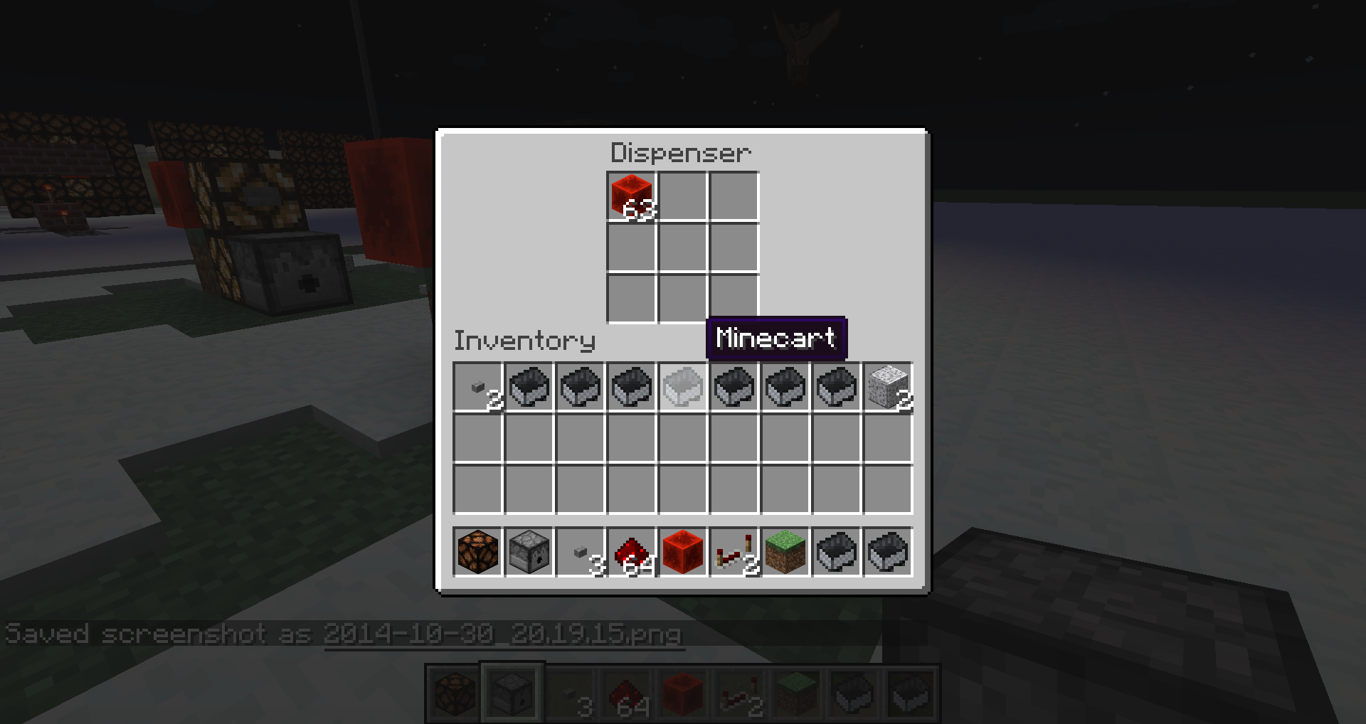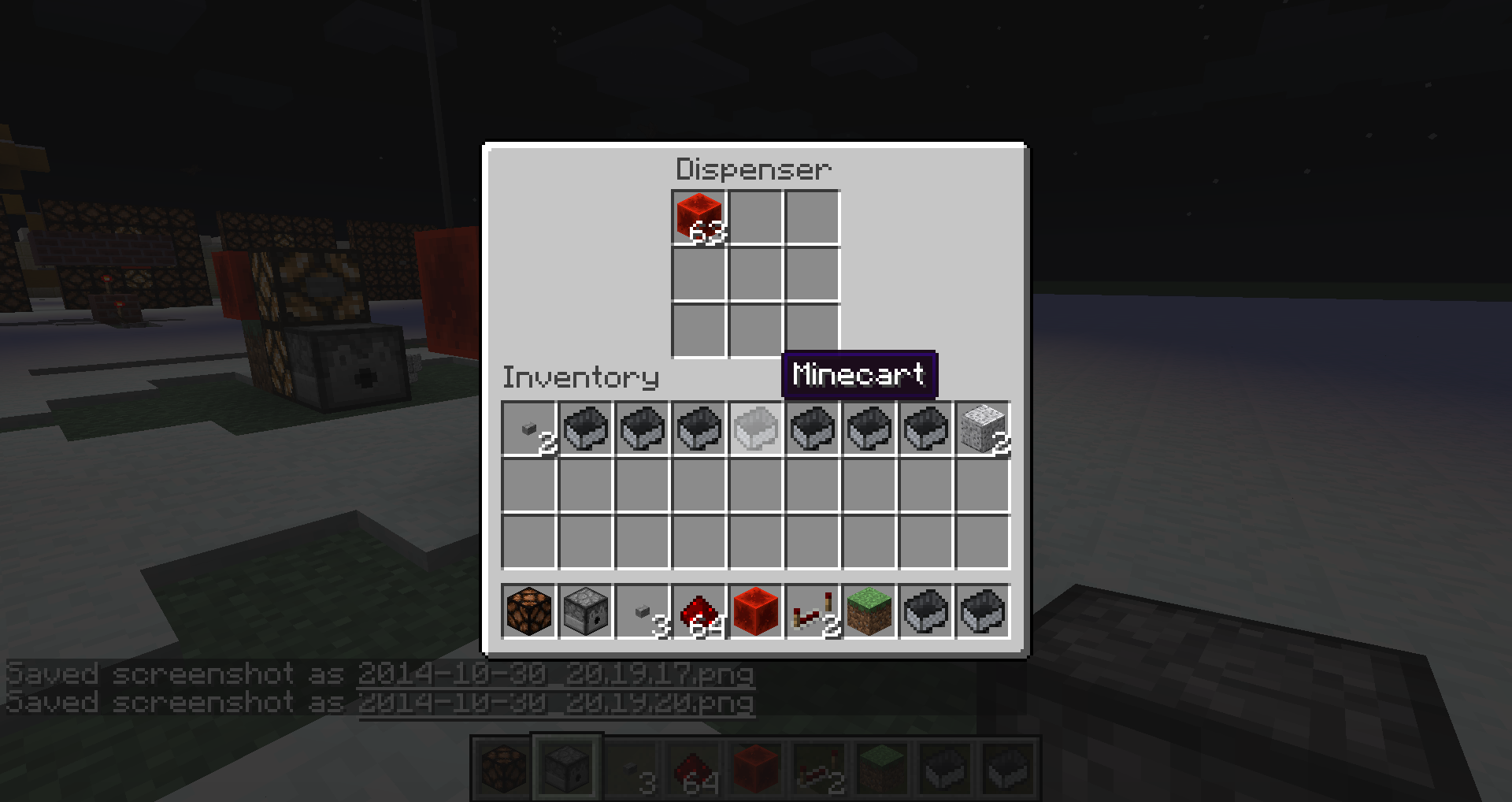 The dispenser in the setup below drops its items only the first time the button is pressed. Further button presses have no effect, i.e. the dispenser does no longer drop its items.