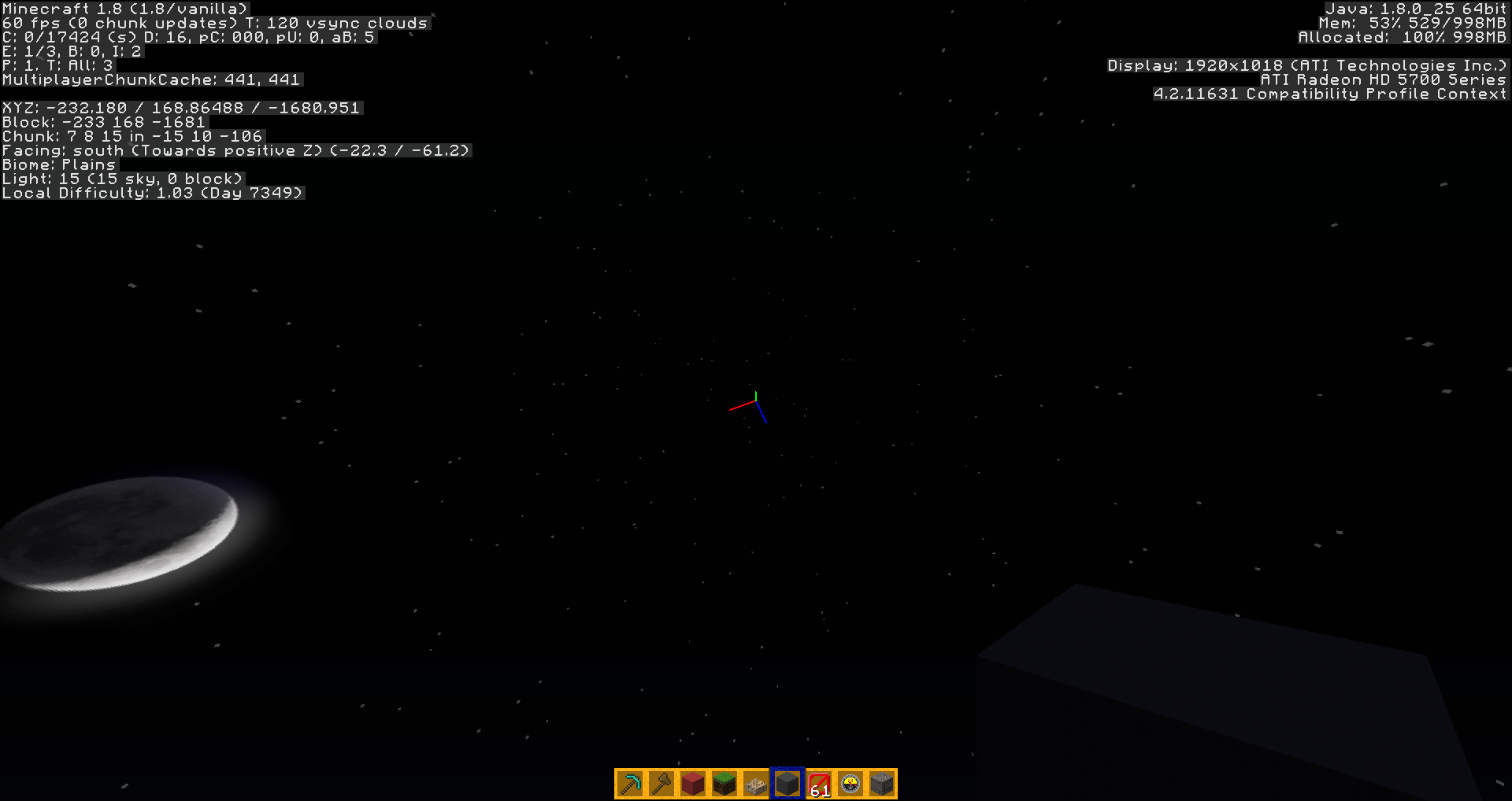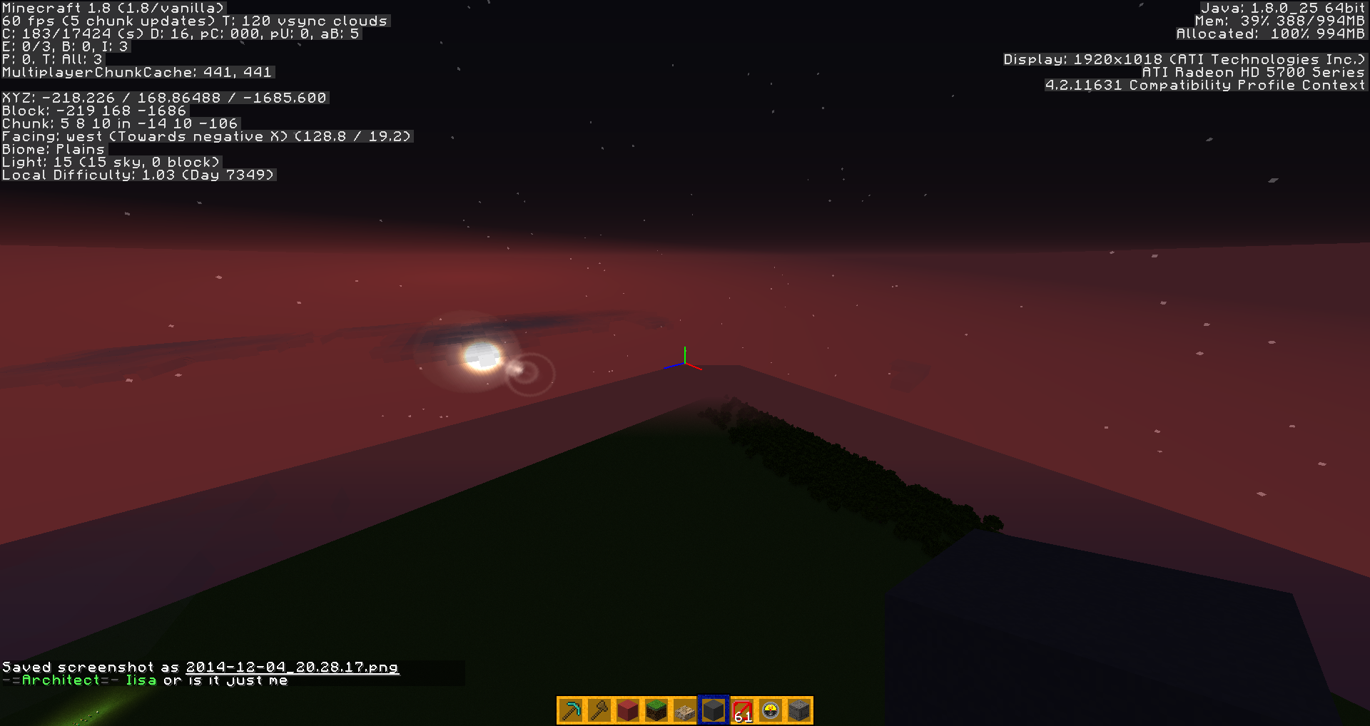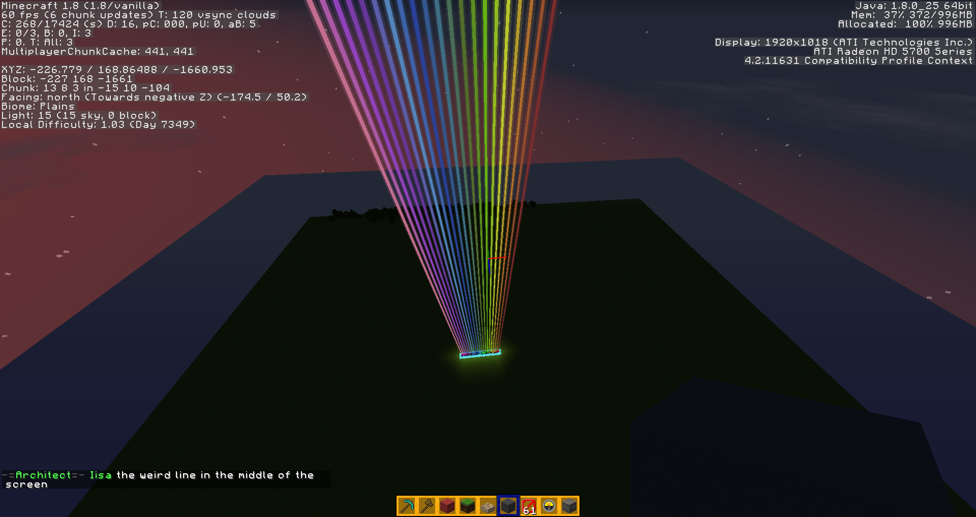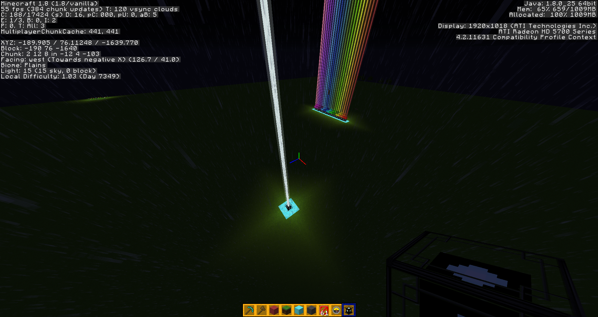 Beacons light beam is disappearing no matter if they are using stained glass blocks or just a beacon. By disappearing it is only at some angles. As you can tell usually in previous versions you can see the beam at all angles. Also when you are in the beam and looking up, you could see the beam continuing but now when you are in it all you can see is the sky. But no beam of light. It does the same thing on a 1.8.1 server/world as well.