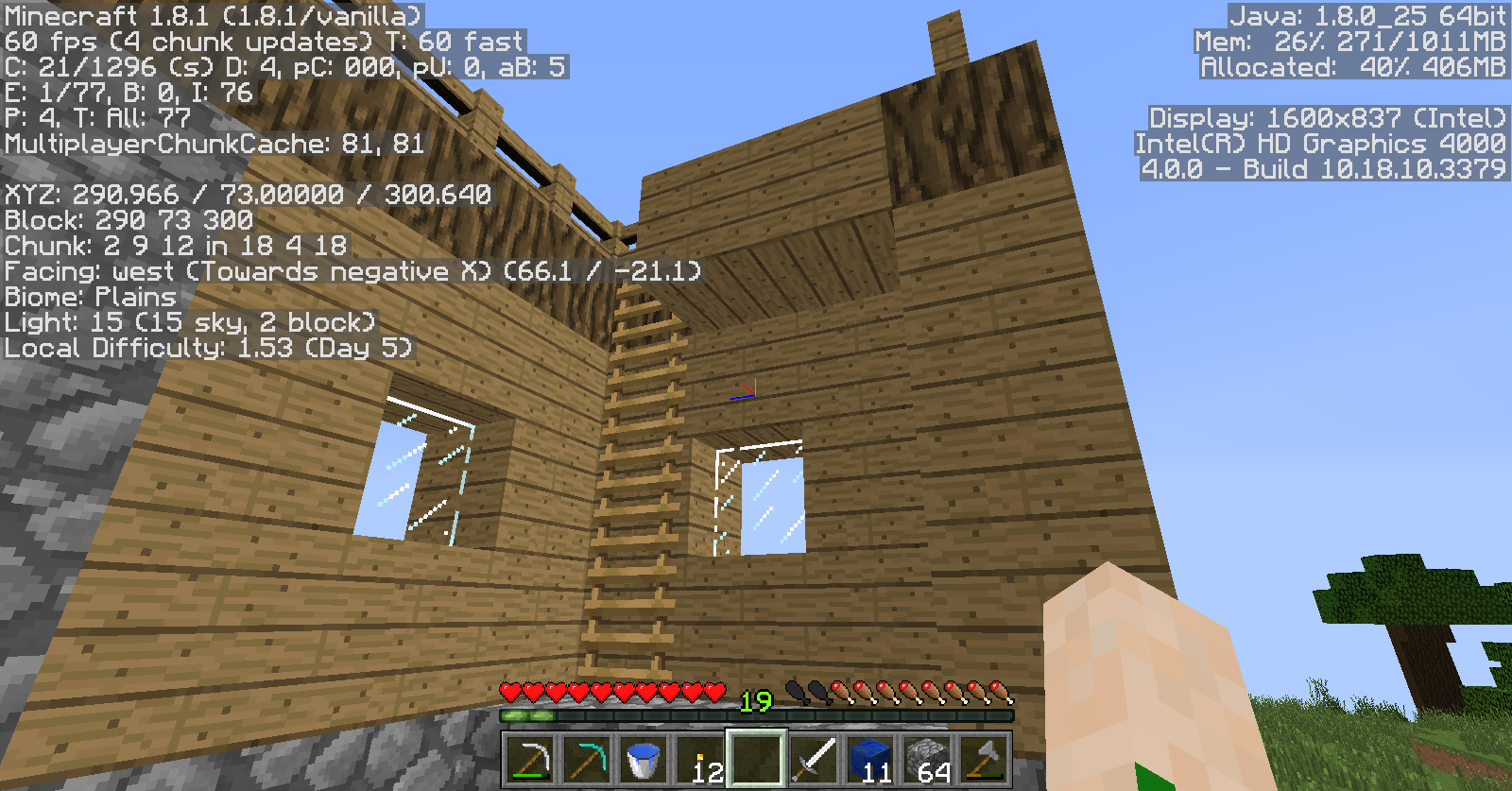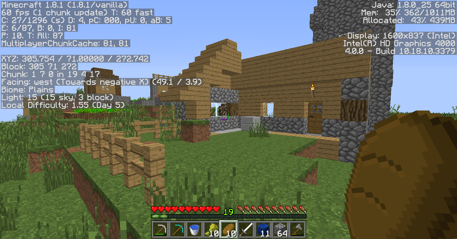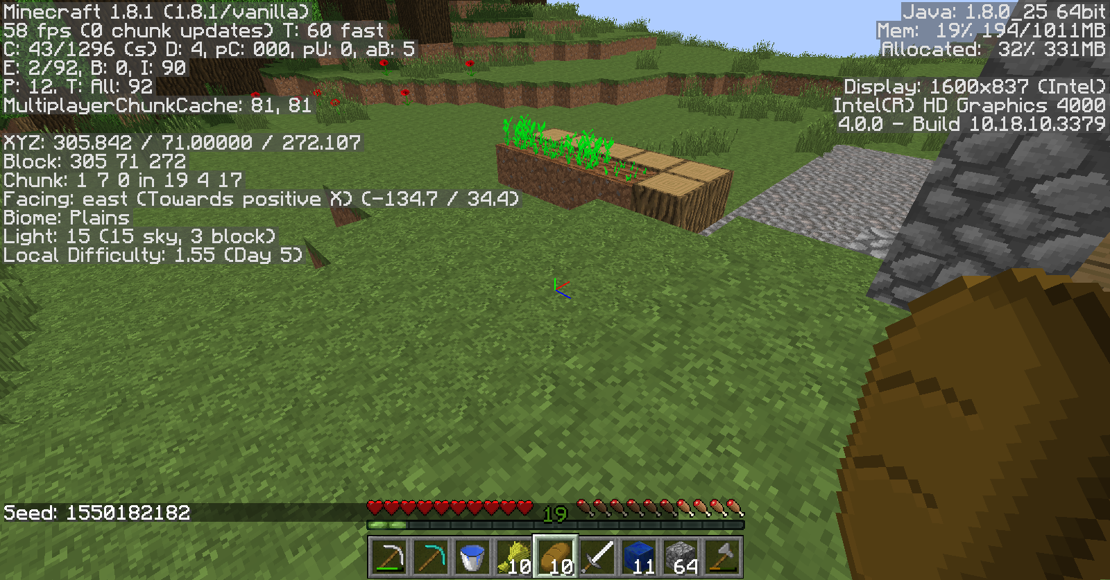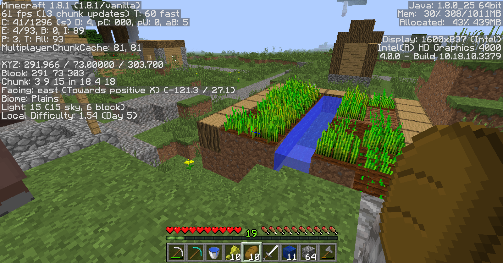 Two buildings appeared to be cut in half, almost as if unfinished, and over half of a farm and a little bit of another farm are missing. Also, many trees were cut in half as well, but beyond that the forest was fine.