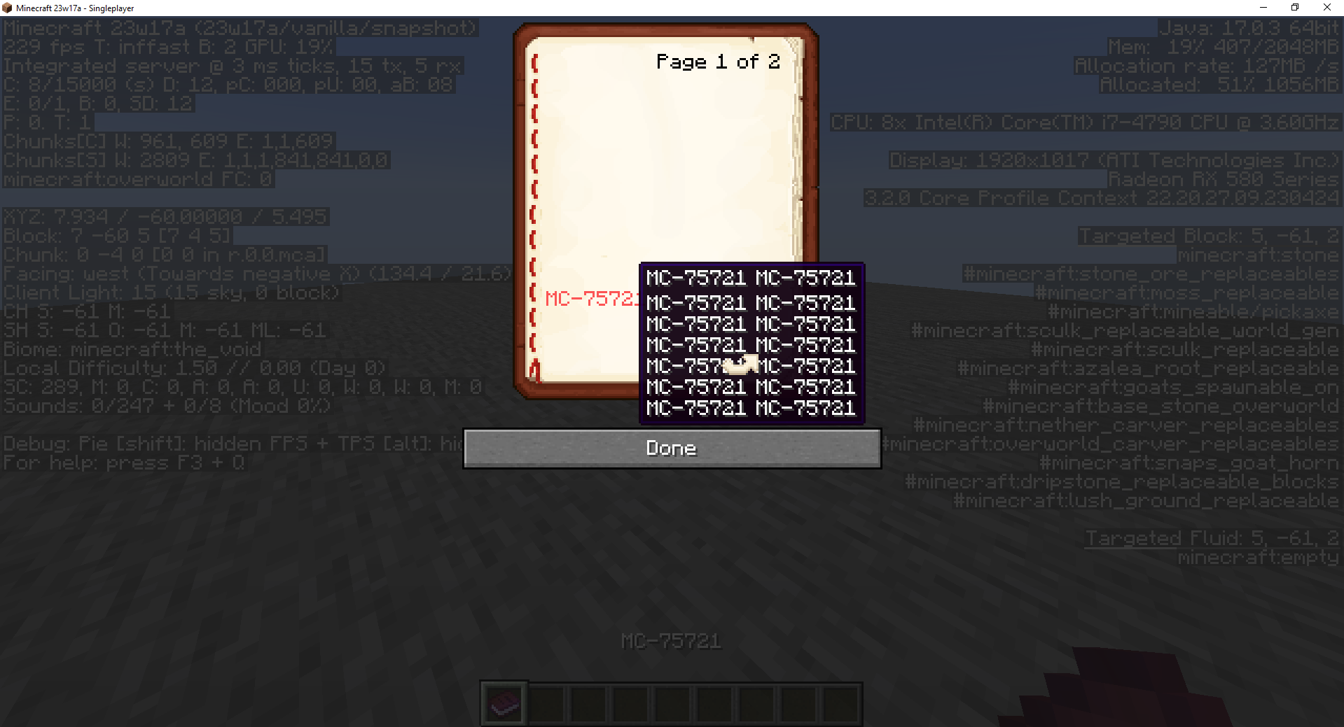 /give @p minecraft:written_book{pages:['[{"text":"\\n\\n\\n\\n\\n\\n\\n\\n\\n\\n\\nMC-75721\\n","color":"red","hoverEvent":{"action":"show_text","value":"MC-75721 MC-75721\\nMC-75721 MC-75721\\nMC-75721 MC-75721\\nMC-75721 MC-75721\\nMC-75721 MC-75721\\nMC-75721 MC-75721\\nMC-75721 MC-75721"}}]','[{"text":"\\n\\n\\n\\n\\n\\n\\n\\n\\n\\n\\nMC-75721\\n","color":"red","hoverEvent":{"action":"show_text","value":"MC-75721 MC-75721\\nMC-75721 MC-75721\\nMC-75721 MC-75721\\nMC-75721 MC-75721\\nMC-75721 MC-75721\\nMC-75721 MC-75721\\nMC-75721 MC-75721"}}]'],title:MC-75721,author:MC-75721}Activate the command block in order to receive a book.