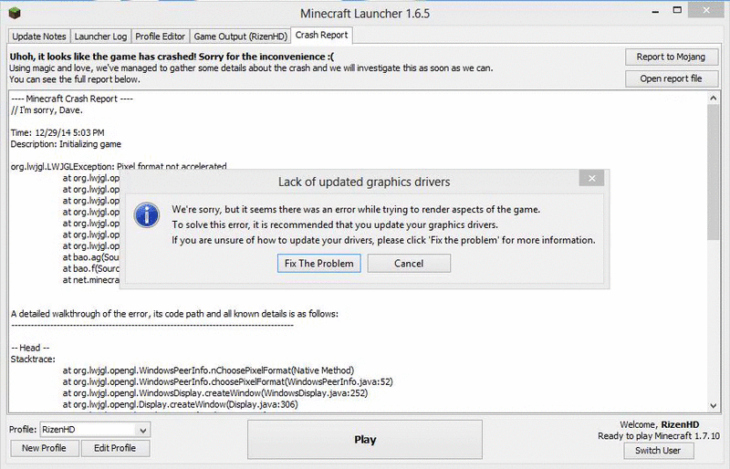 When i go to start up Minecraft in the launcher it loads then it stats "Lack of updated graphic drivers". I just replaced my hard drive with a new one and with my old hard drive i was able to play Minecraft but now with a new hard drive i get this error. I think it has to do with Mojang changing the download because Minecraft used to be a 612 KB file now it has turned into 1112 KB file and it installs 40.33 MB. So can someone please help me?5