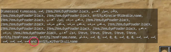 When using a selector which fits on more than one entity Minecraft will list all the affected entities and put an "and" between the last two. This "and" doesn't get translated when changing your language.