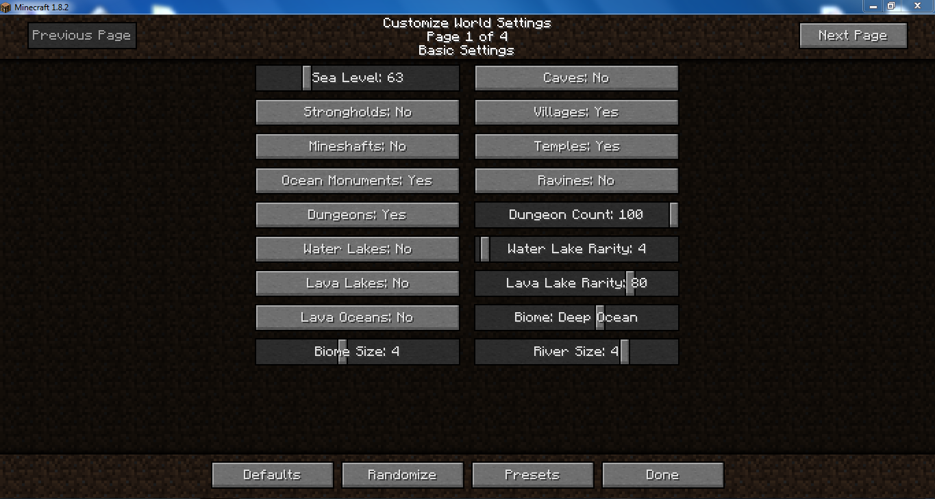 Since the bug of the water generating around Ocean Temples was fixed, I made a world to take a look, I discovered that no water generated, actually, a forest did. I tested this with Deep Ocean biome and the Frozen Ocean biome. At first I left the Ocean Monument to 'yes' in the customization menu. That's when it happened. Water level was set to '1'. In the pictures are the seeds of the worlds I tested on. In the FrozenOcean biome a kind of Forest/Taiga something appeared to form.