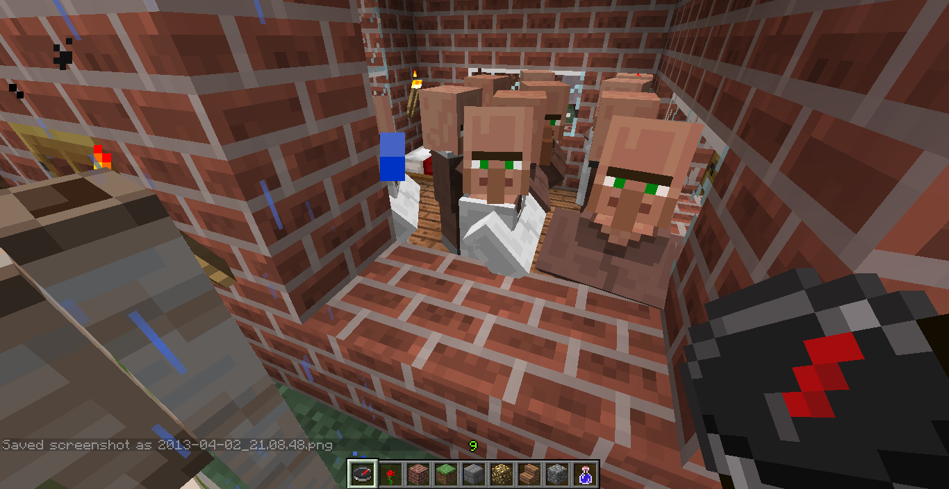 Part of me would like to see this AI taken a step farther where villagers would socialize during the day but would tend to associate themselves with particular doors (apartments) at night, generally trying to return to the same door (making it easier at night to find a particular villager offering a particular trade), and trying harder to spread themselves uniformly among doors within the community at night. Children at night would tend to go home with their parents. But, what I see in 14w07a is a huge improvement in the AI, and makes creating large villages more interesting than they were with the old AI.