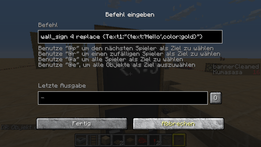 2. execute @p ~ ~ ~ setblock ~-2 ~-1 ~ minecraft:wall_sign 4 replace {Text1:"{text:"Hello",color:gold}"}To escape text properly you need to replace