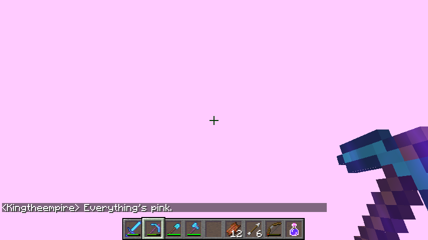 Something strange has happened. While I went mining, my sister created an ender portal. She went in first and then a few seconds later, I jumped into the portal too. When I entered the portal, (I was in creative mode by the way,) the entire screen except for my pickaxe and the hub was pink. I used a Potion of Night Vision beforehand when I was mining which is what produced the pink light. I waited a few minutes but nothing happened. I could hear my sister firing her bow to defeat the enderdragon. I cleared my potion effect and pulled up the debug screen to take the second screenshot. Without the potion effects, my screen turned black. My sister teleported to me but couldn't see me. I then attempted to teleport to her, but still, no luck. I was invisible on her screen. Using /kill to send me back to my spawn point was the only way to return my screen back to normal.