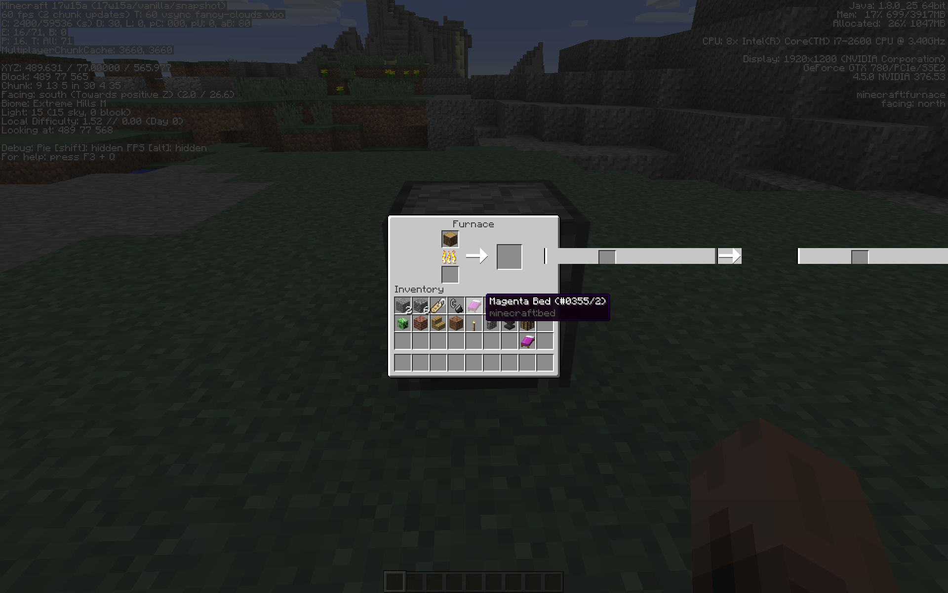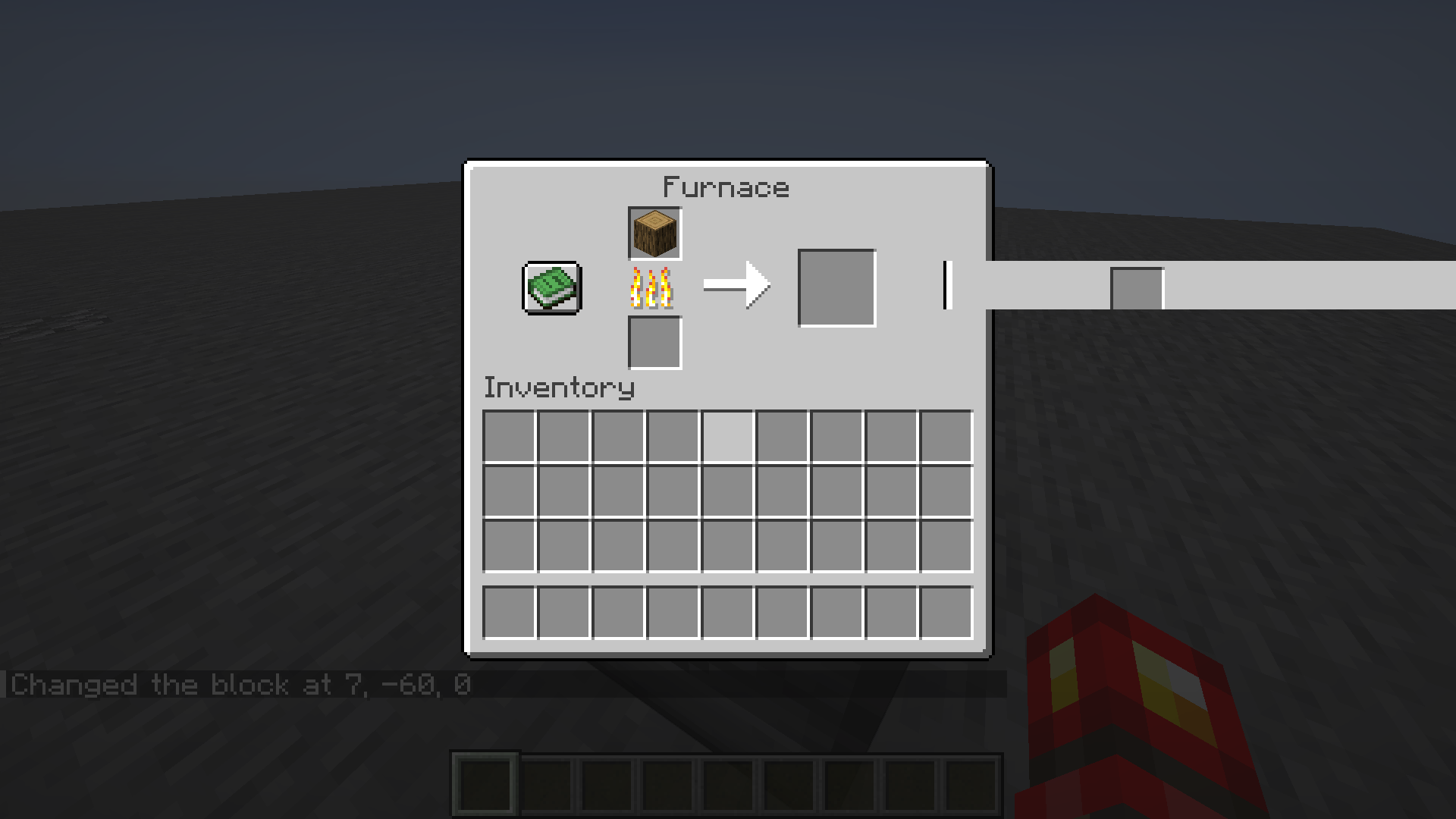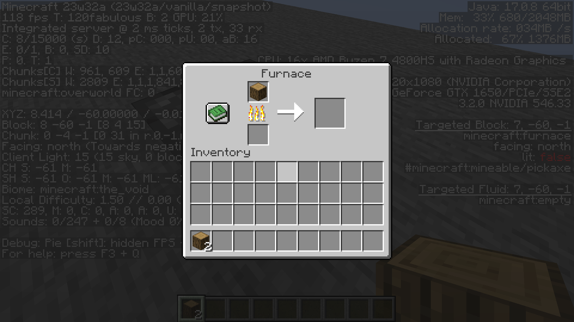/setblock ~ ~ ~ furnace 0 replace {CookTimeTotal:1,BurnTime:999,CookTime:1,Items:[{id:log,Count:1}]}This issue was fixed after changes to container sprite locations/rendering behavior in Snapshot 23w32a.