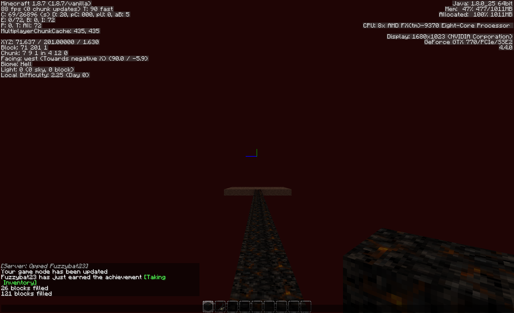 I'm running my own server and have noticed this problem on a past server. Before building a gold farm on top of the nether, I first built a platform approximately 10 x 10 blocks at block level 200. Nothing at all spawned. I then recreated this experiment on a single player map. As you can see from the picture, plenty of spawns. I then started a server on my personal computer and connected to localhost. Again, no spawns. This seems to be an issue affecting minecraft servers. Attached also is our server properties (with the seed deleted of course) so you can see our render distance is set to 10 so that is not a viable fix.