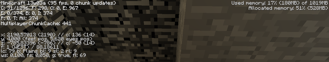 Ever since I updated to the Snapshot 13w04a(also 13w03a), I've had massive FPS Drops in the Overworld, which has made me pretty much unable to play. This doesn't affect any other dimension, as I have about 96-160 FPS over all in the end, and 110-180 in the nether. Back in the later snapshot (13w02b) I never had this problem. But now I can't get more than 16FPS in the overworld.