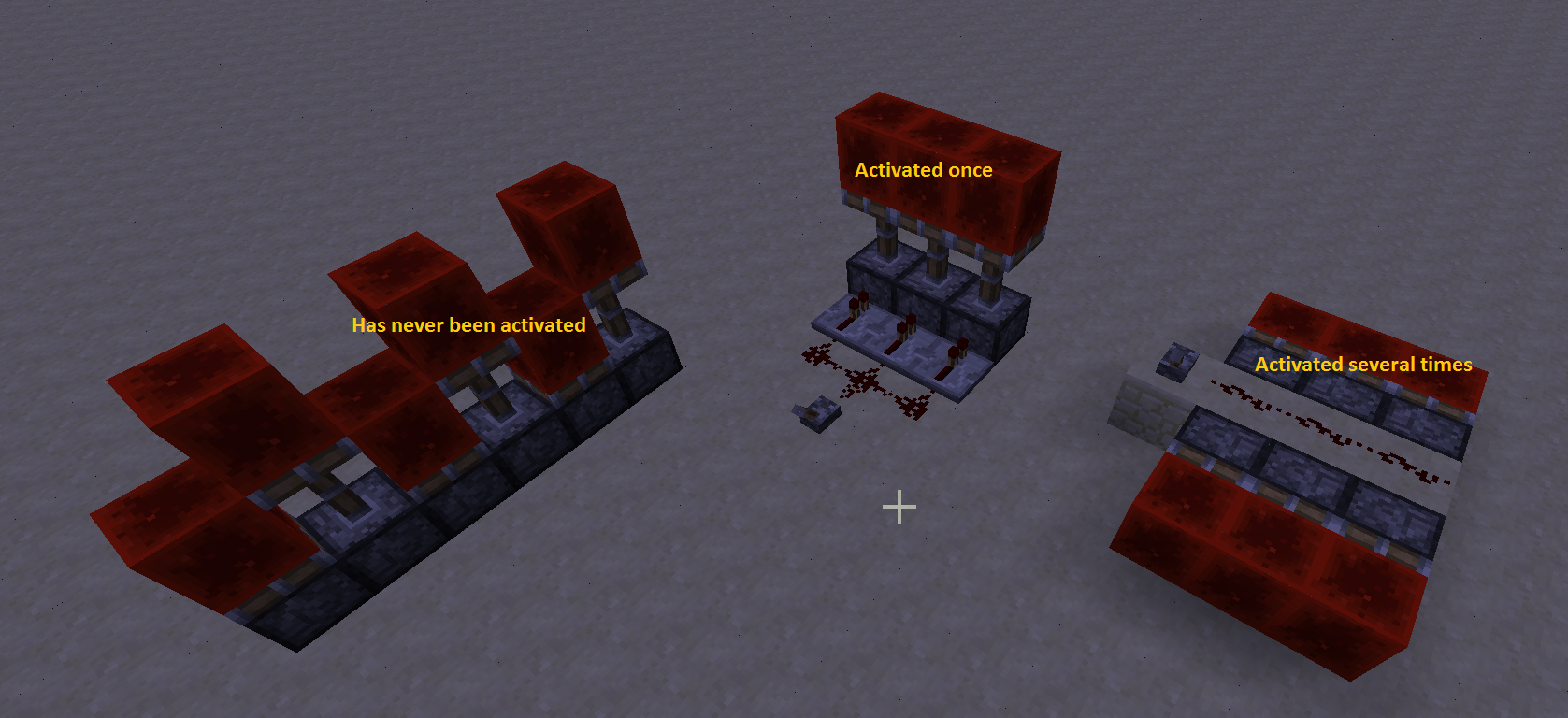 If the player activates a piston (this pointing upwards and with a block redstone above) with a block redstone and then removes the block that was activating the piston, this remains activated as a result of this pushing, which has no effect if the piston this deactivated.