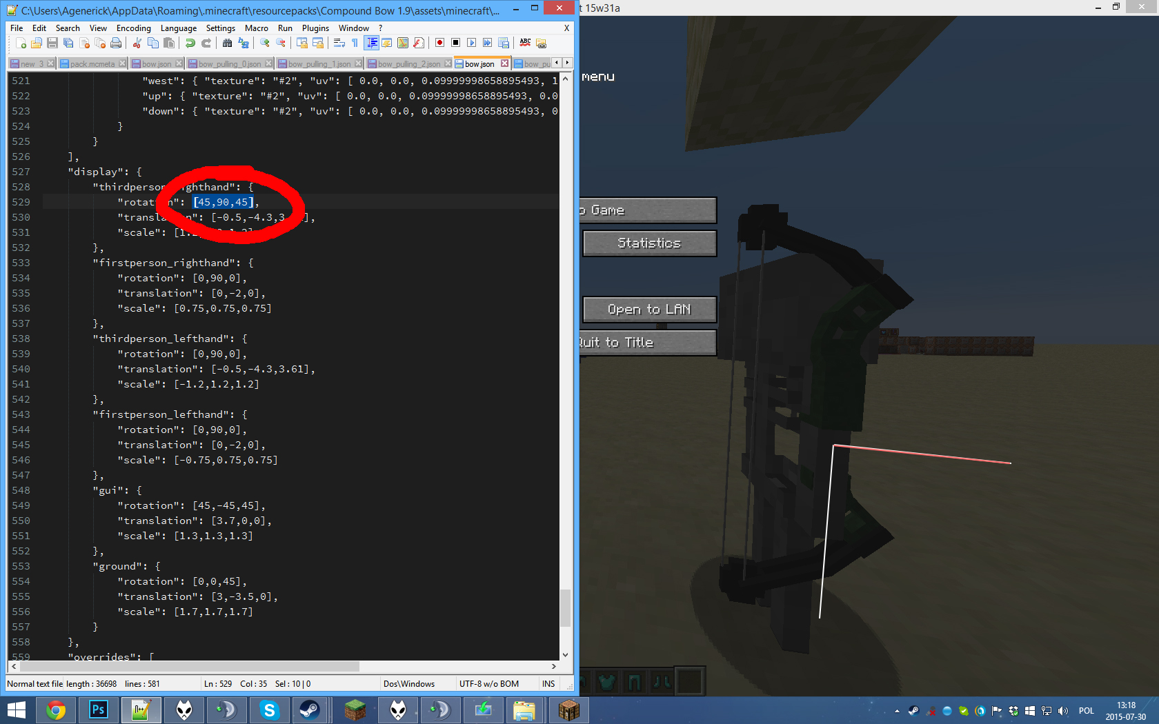 In "display" tag of the item model json file, the rotation is not acting as it was in previous versions. The X axis is absolute to the whole model, but the Y and Z axis are relative.