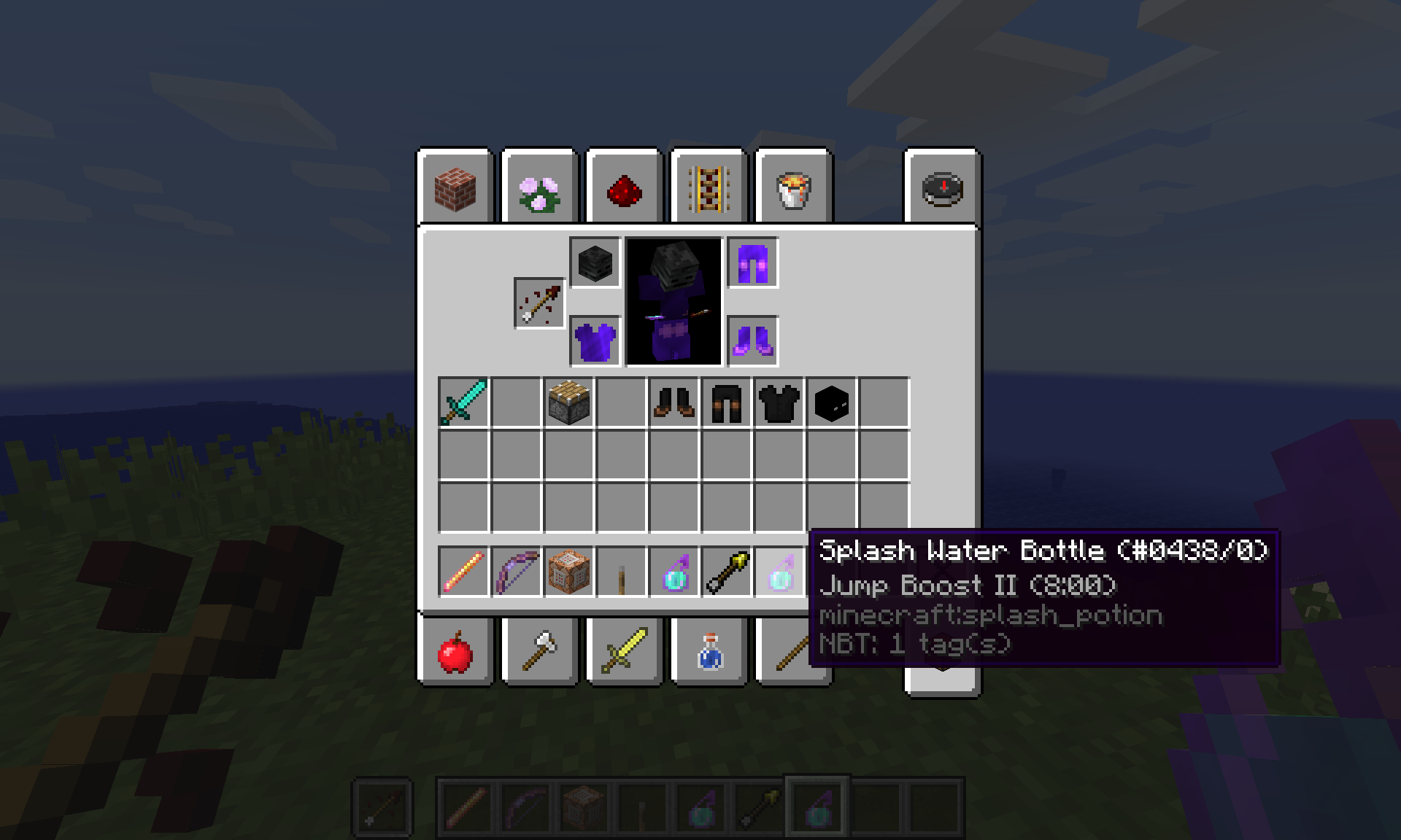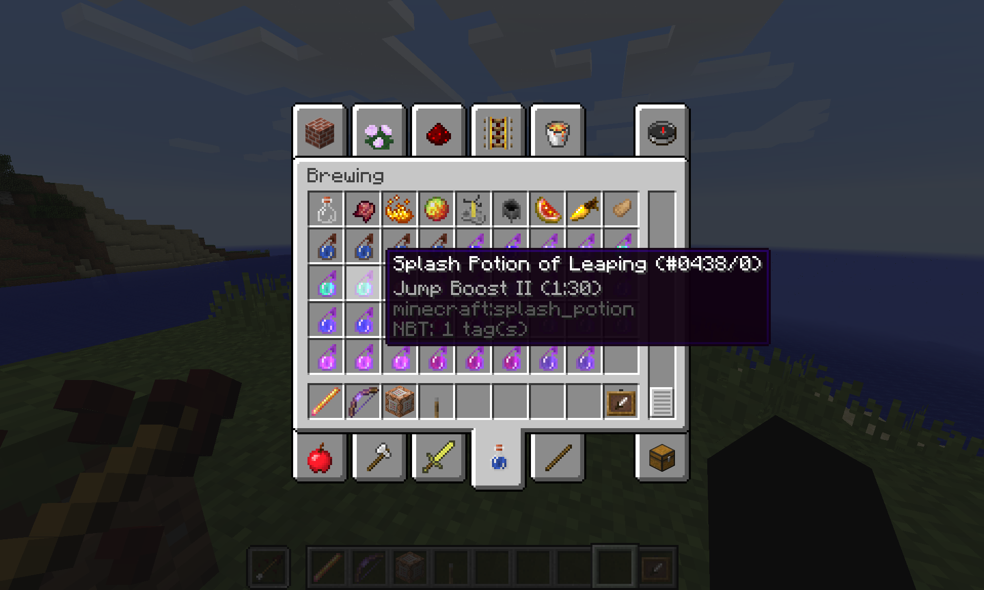 Expecting: A splash potion of Jump Boost II for 480 seconds when running the command /give @p splash_potion 1 0 {CustomPotionEffects:[{Id:8,Amplifier:1,Duration:9600}]}