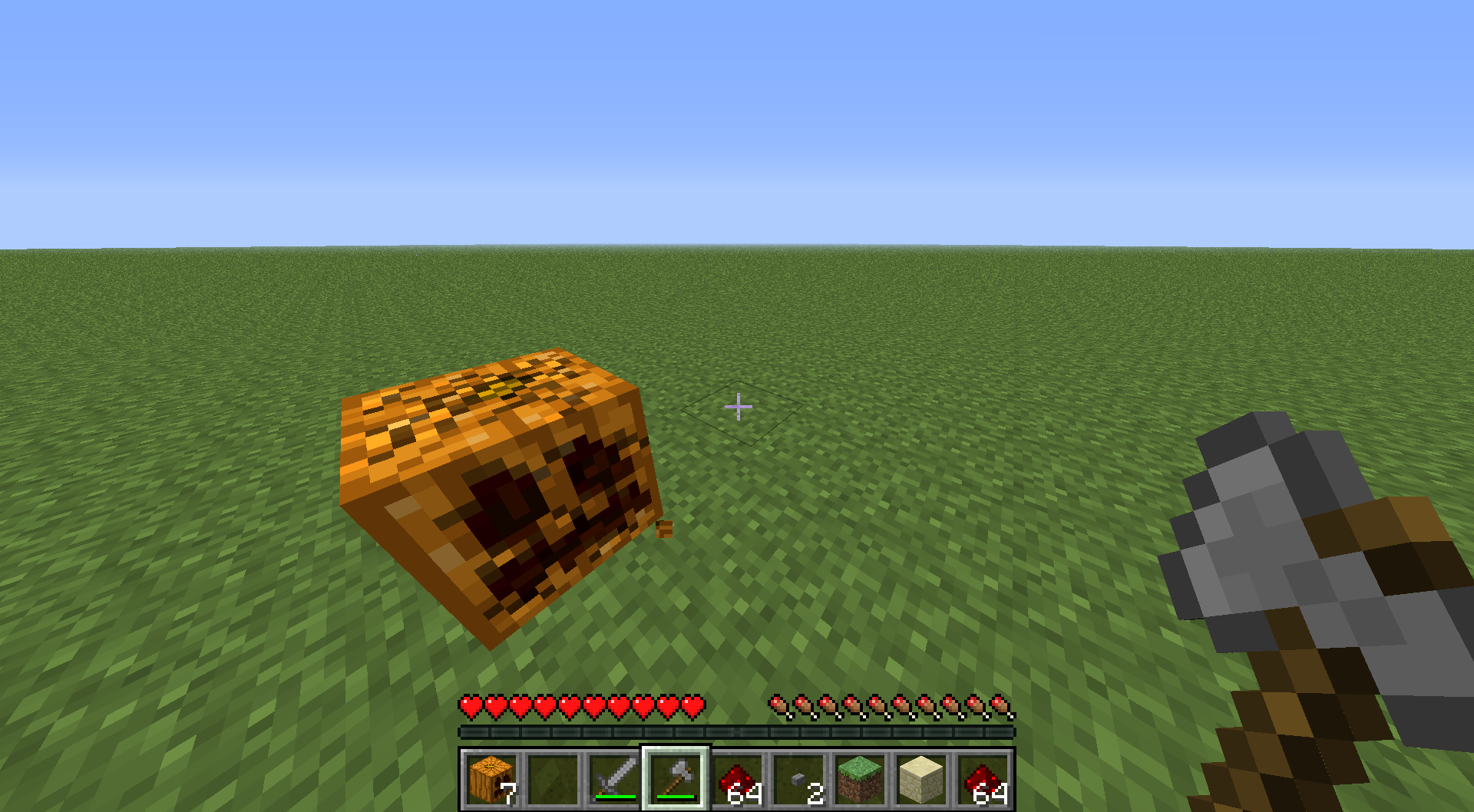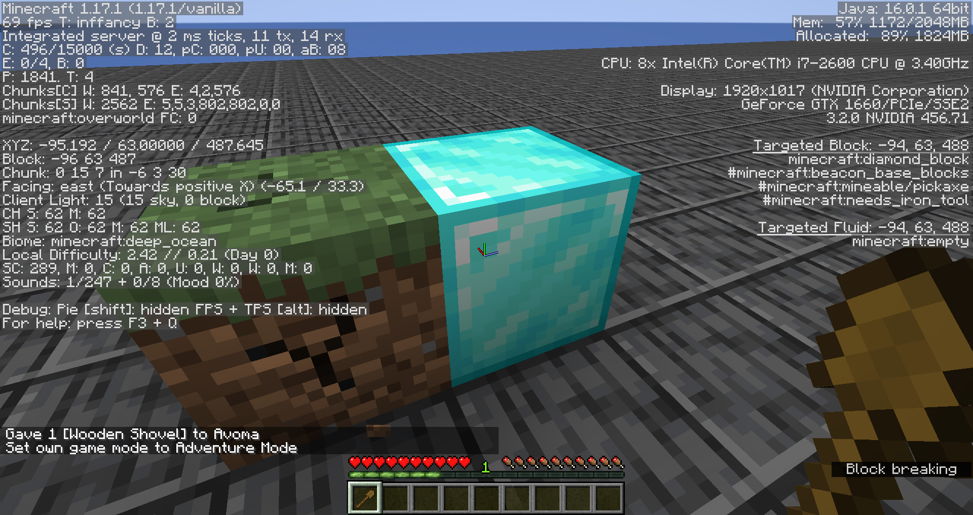 Give yourself a shovel that can destroy grass blocks by using the command provided below.