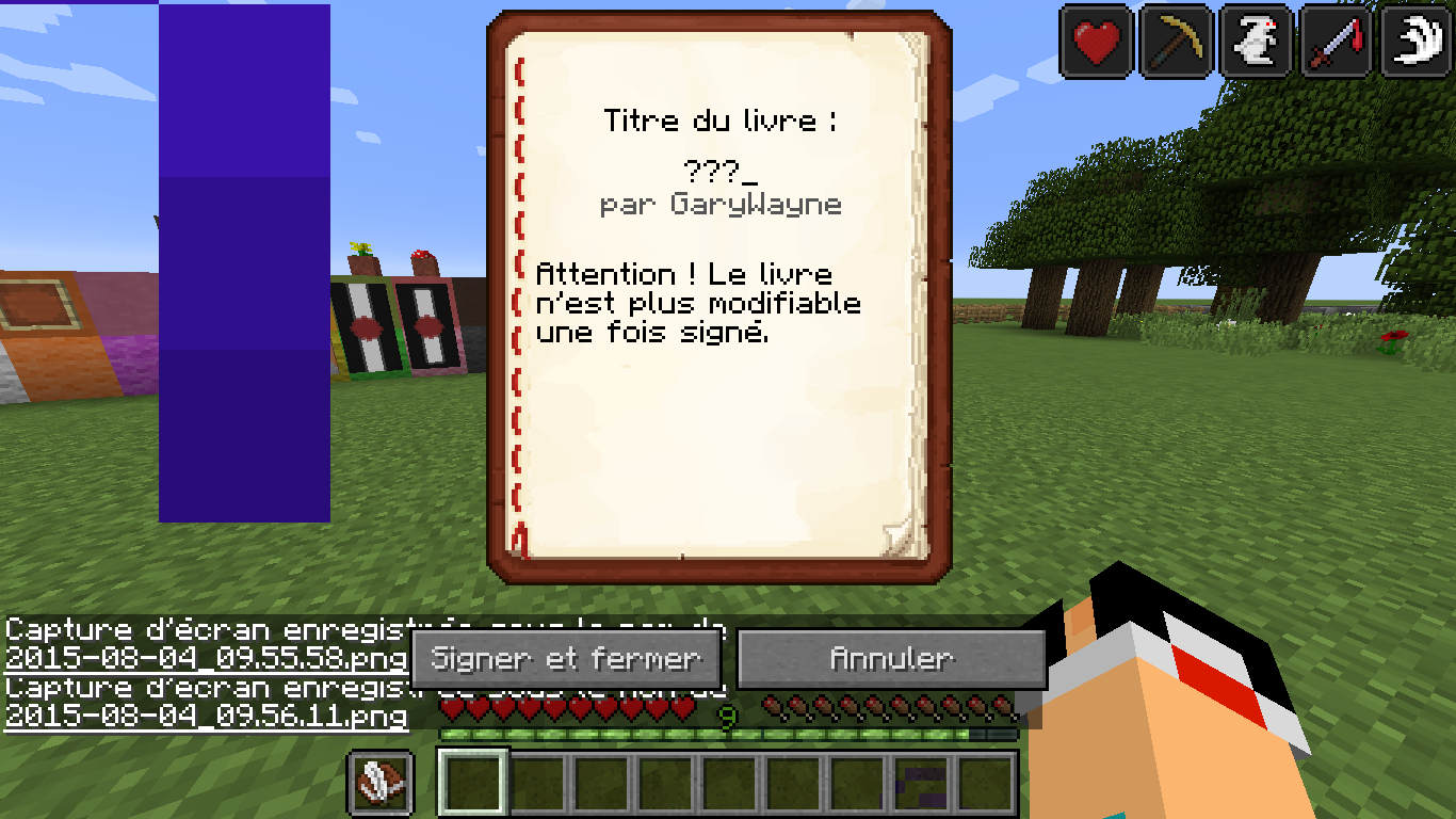 Take a book and quill, sign it in your off-hand, and replace it in your inventory, it will turn into a book and quill.