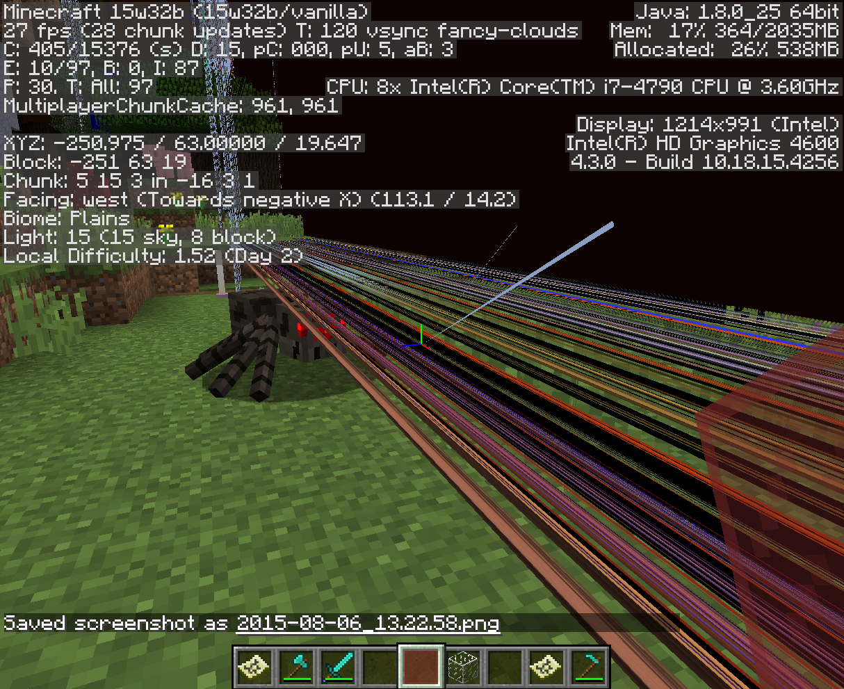 I've attached some pretty weird images from a world created in 15w32b. Before you ask, my graphic drivers are up to date as of 7-17-15 (the latest release). The missing textures (seeing through the chunk) never go away even if you leave and return. The black line in picture 3 shows up from either side if you fly through it. These occur on every world opened or created in the snapshot. Default texture pack.