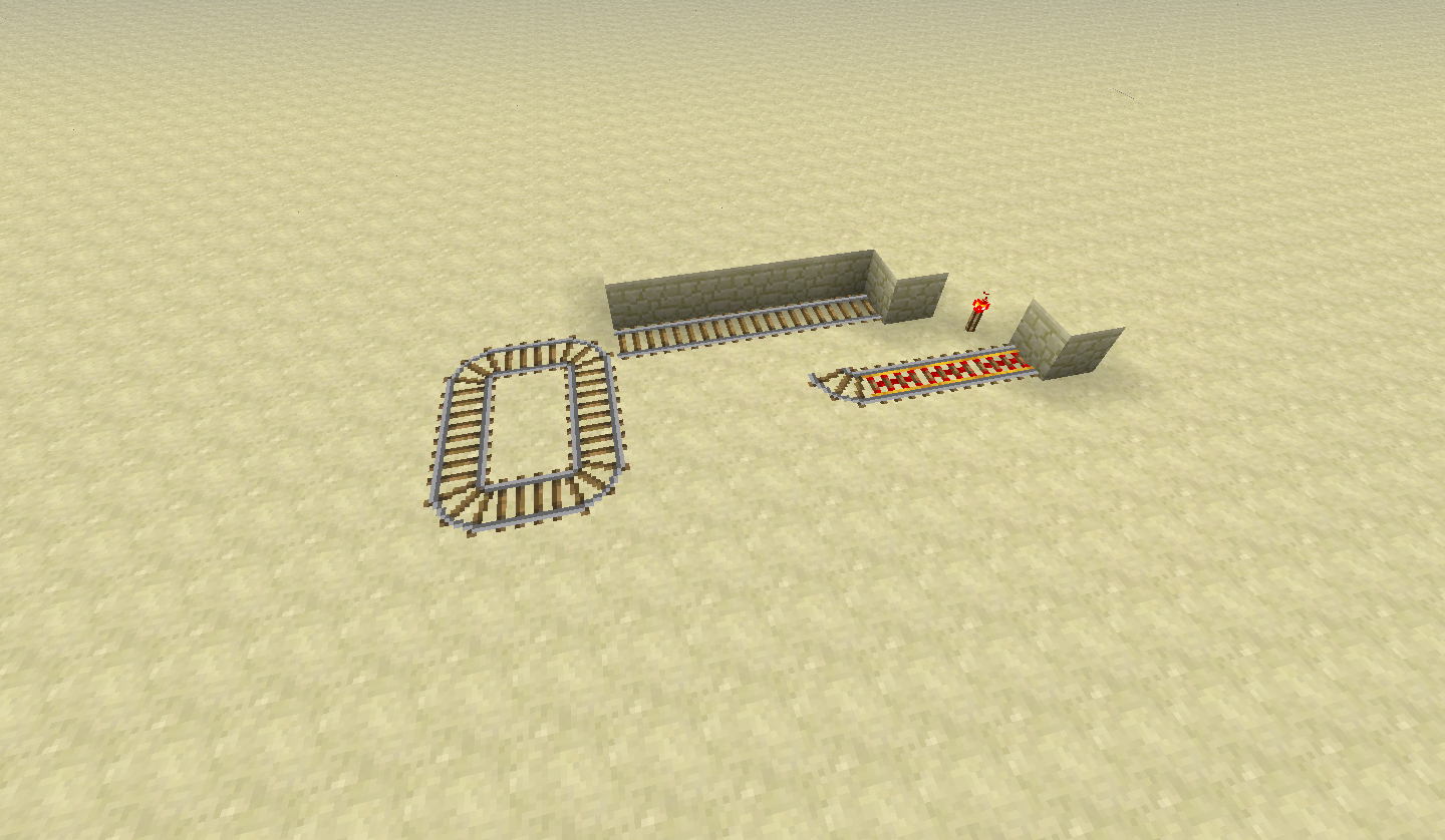 When making a track system like the one in the photo, placing two minecarts inside of each other and pushing them both of them it will then result in a mine craft that will keep on going on the track even with out powered rails.