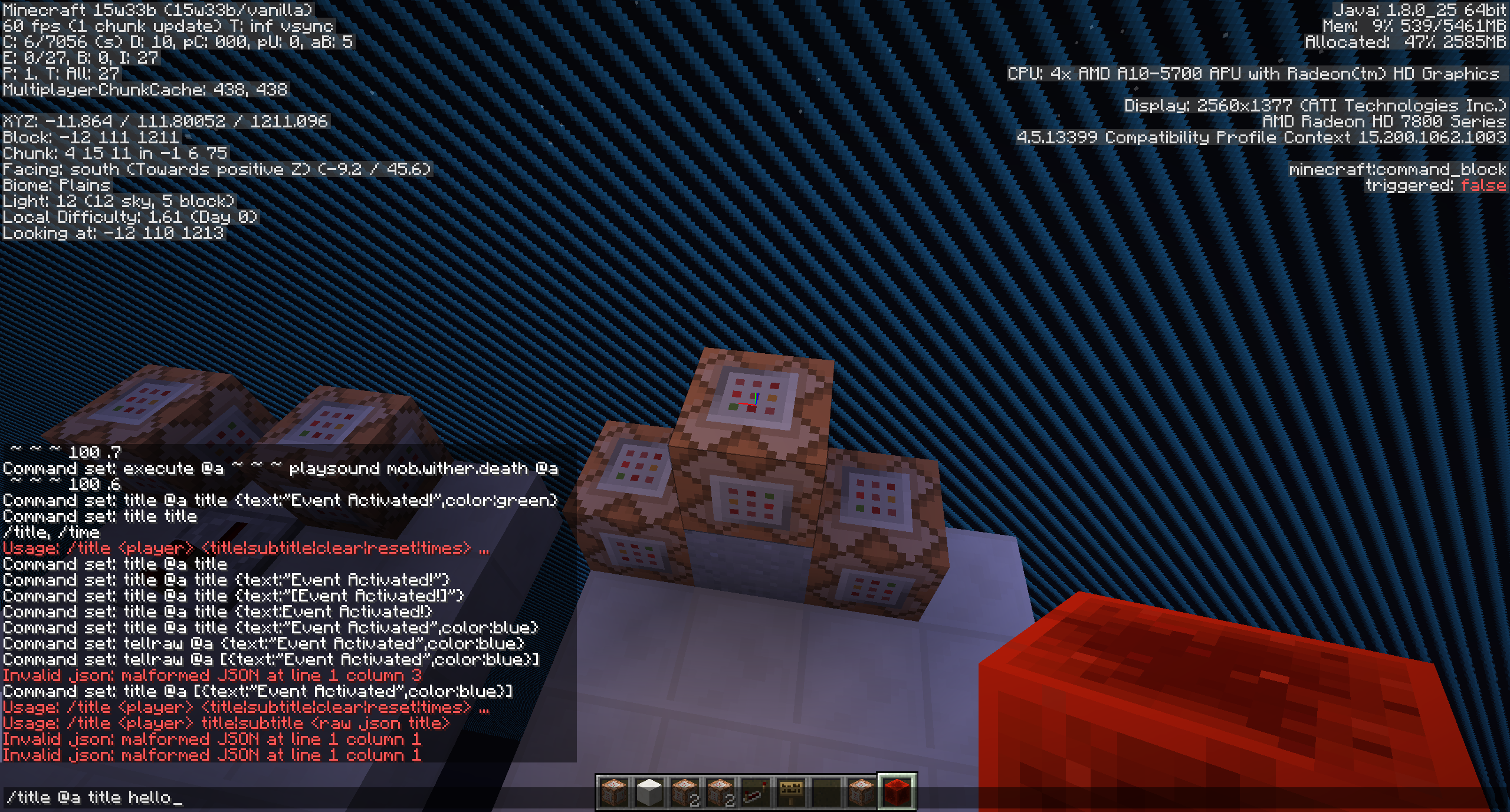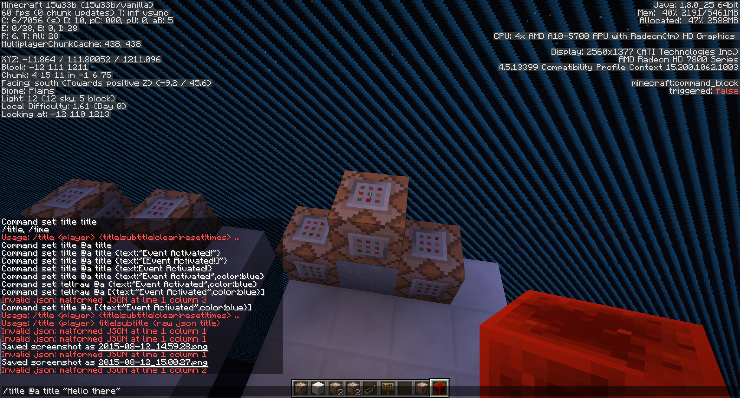 /tellraw is broken again... "malformed JSON at line 1 column 1." It wont let me do /tellraw & /title. Something your doing is messing it up. this happened before on 15w31a. (Or was it b?)