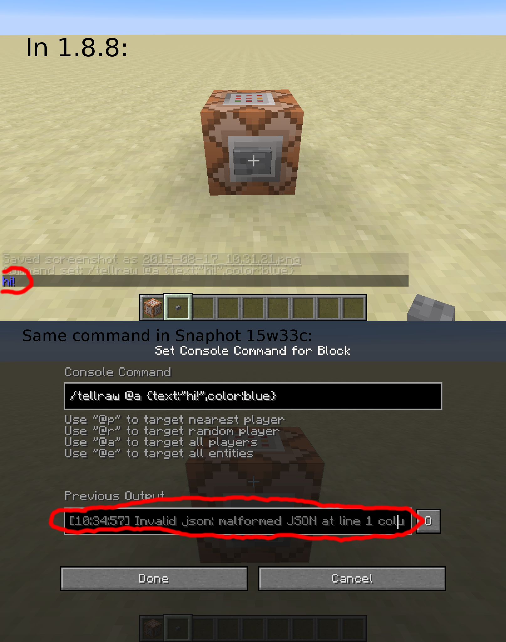 Any /tellraw commands that I try to execute in the latest snapshot, which worked perfectly fine in 1.8.8, do not work.