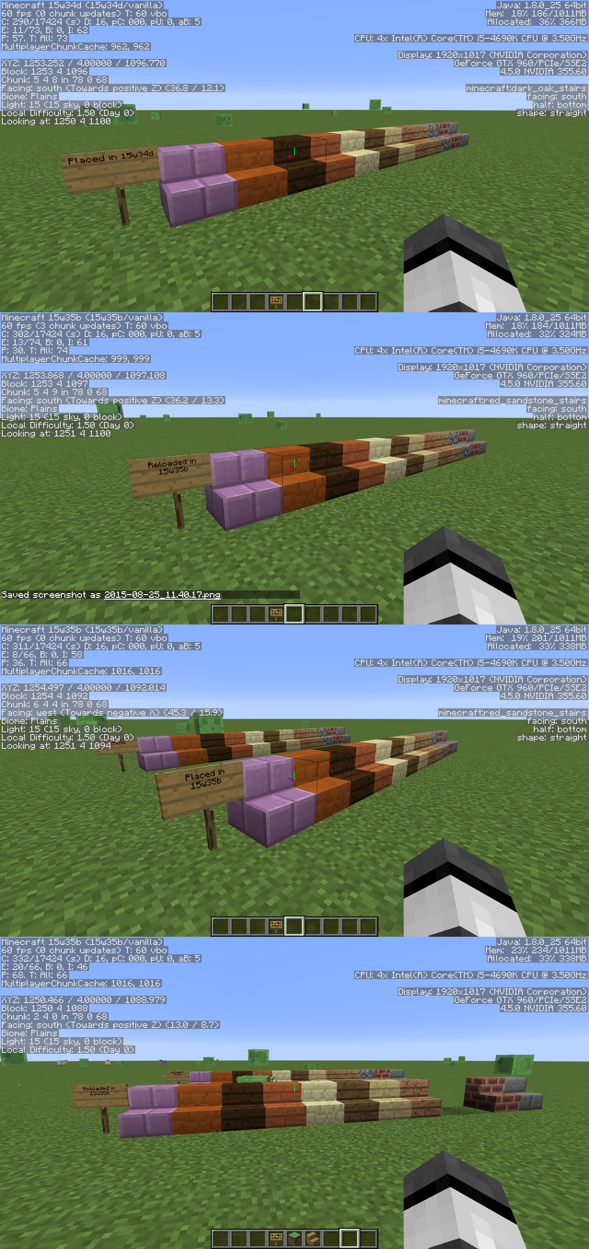 When placing stairs of the wooden and cobblestone varieties in the latest snapshot and then logging out and back in all the stairs placed in the latest version disappear, leaving behind a lighting glitch. However, stairs placed in previous versions then reloaded in 15w35b do not disappear.