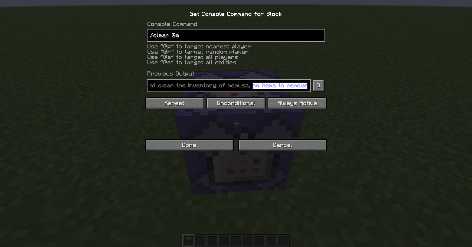 To reproduce: get a command block, place it down and click in it. Set the type to repeat and always active. For the command, type in "/clear @a" Items will still be in your inventory but they can not be placed, however if it is in the first slot, using select block replaces the item, and that item also stays in your inventory.
