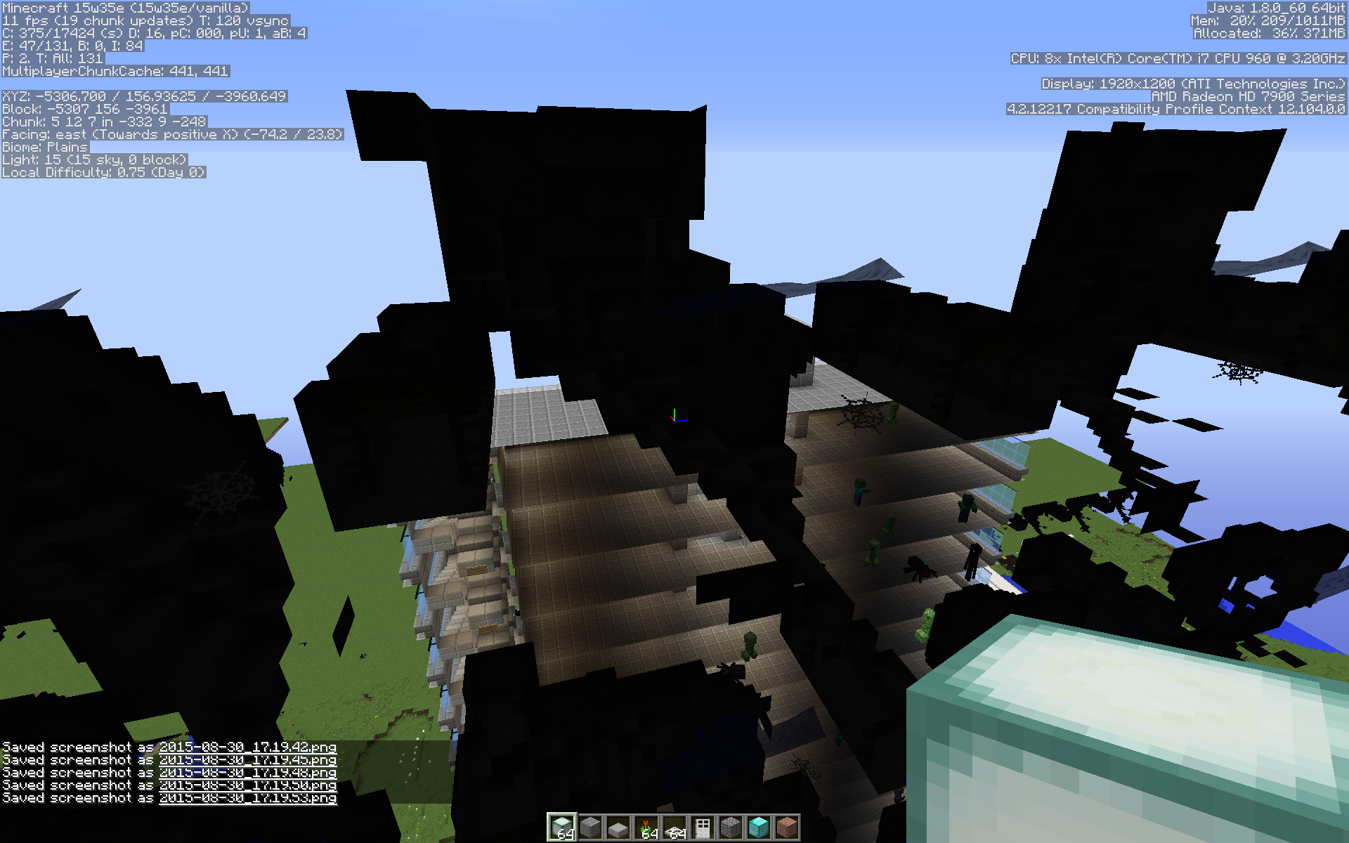 The attached screenshots were all taken within a few seconds of one another in roughly the same location in the world, just rotating the point of view.