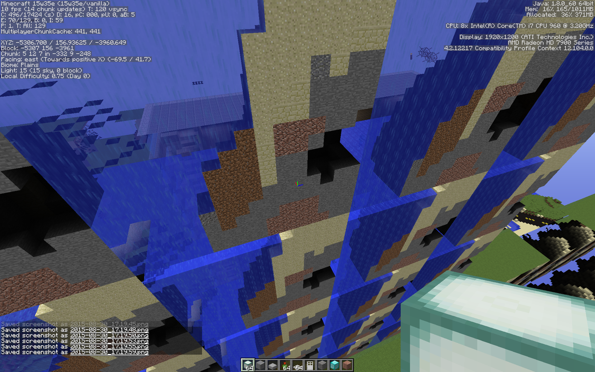 Repeated use of /fill and /clone to build structures sometimes results in a circumstance where the updated blocks do not immediately appear after issuing the command. Disconnecting from the server and reconnecting then results in very strange visual artefacts that flicker rapidly through various configurations from frame to frame. These artefacts seem to be related to some sort of corruption in the client state; repeatedly signing out and back in does not clear the artefacts, but a full restart of the client does, without requiring any action on the server.
