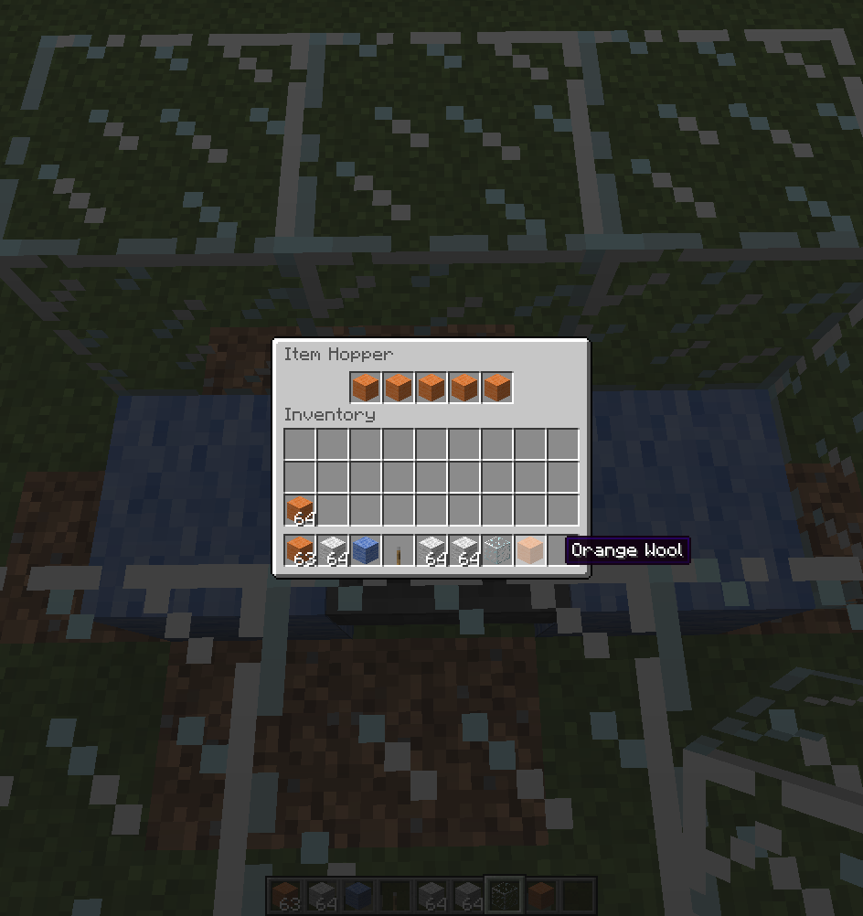 In this setup there is a hopper with each spot full of one orange wool. There is a water stream to push items past it. Above this stream are two perpendicular streams that push items into a corner. I throw a stack of white wool in the stream followed by a stack of orange wool. I break the block allowing the two different stacks to meet the bottom hopper. The two stacks both pass without the hopper taking any wool.