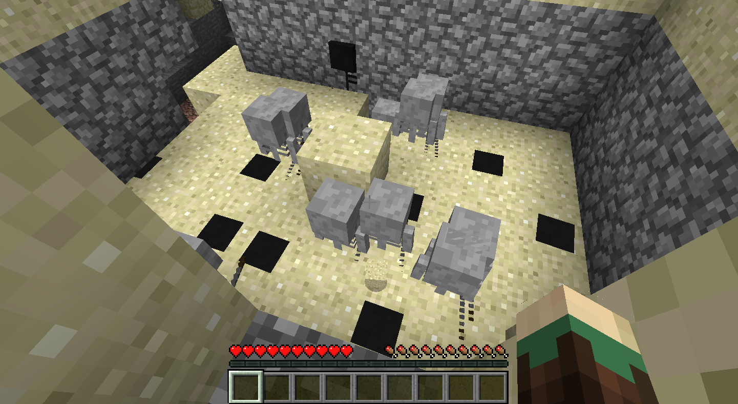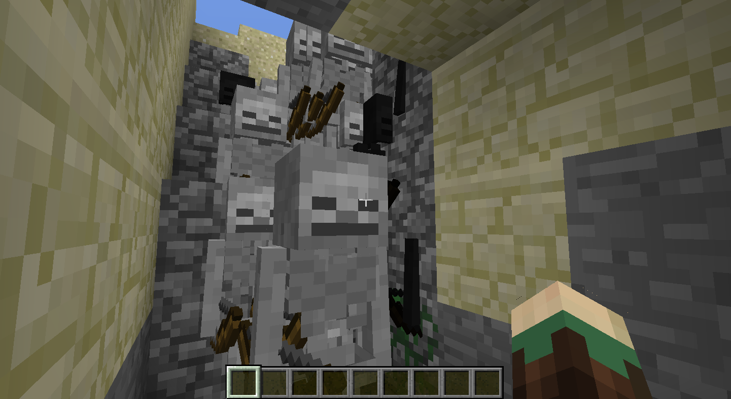 I created a custom world with the "beach" biome as the entire world biome. World Cheats where turned on. Dungeons where turned up. I started following a river from spawn and came across a skeleton spawner in the sand. Sand had fallen onto the spawner and there where skeleton heads sticking up out of the sand. I went into creative mode and started breaking the blocks the skeletons where buried in. The skeletons where not moving, they just stared ahead frozen. It was daylight and the skeletons where not burning up. The skeletons stayed frozen and kept spawning in the sand blocks even as I broke blocks around them.