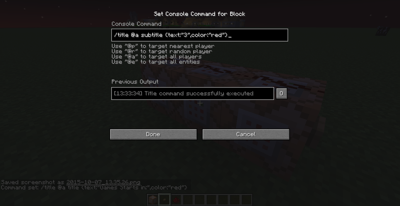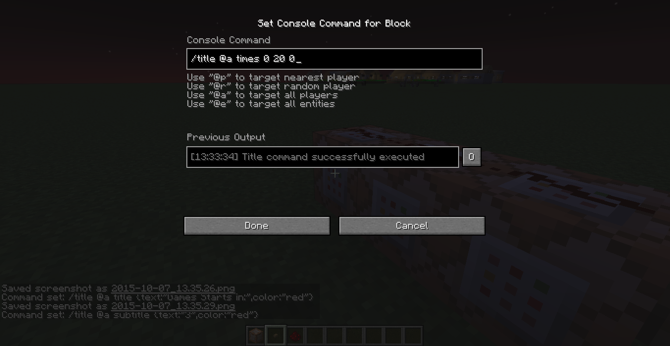 I tried a title command in 1.8, then the same one in 15w41b. It worked in 1.8, but not the snapshot. The error in the command block says "Invalid json: malformed JSON at line 1 column" In 1.8, all three commands activate, but in the snapshot only the last one activates. I am not aware of any changes to the title command in the snapshots, so I am not quite sure why this isn't working.