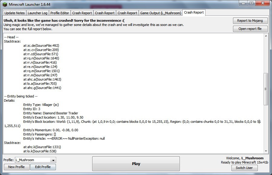 /summon Villager ~-1 ~ ~ {Profession:0,Career:100000,CareerLevel:100000,Offers:{Recipes:[{rewardExp:0,maxUses:100000000,uses:0,buy:{id:"minecraft:leather",Count:64},sell:{id:"minecraft:leather_boots",Count:1,tag:{display:{Name:"Leather Booster",Lore:["Leather booster provides","tiny speed!"]}}}}]},Invulnerable:1,Attributes:[{Name:"generic.movementSpeed",Base:0}],Silent:1,CustomName:"Leather Booster Trader",CustomNameVisible:0}Also another problem is that the trade rewards exp even I set the rewardExp to false. Crash report is in the attachment, as well as a game screenshot.