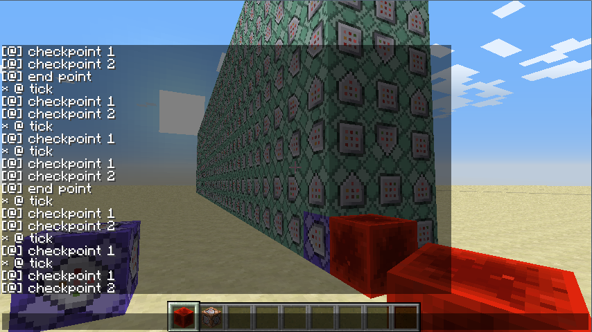 2. For the 400th, 800th, and 1200th block in the chain, I entered "/say checkpoint 1", "/say checkpoint 2", and "/say end point" in them.