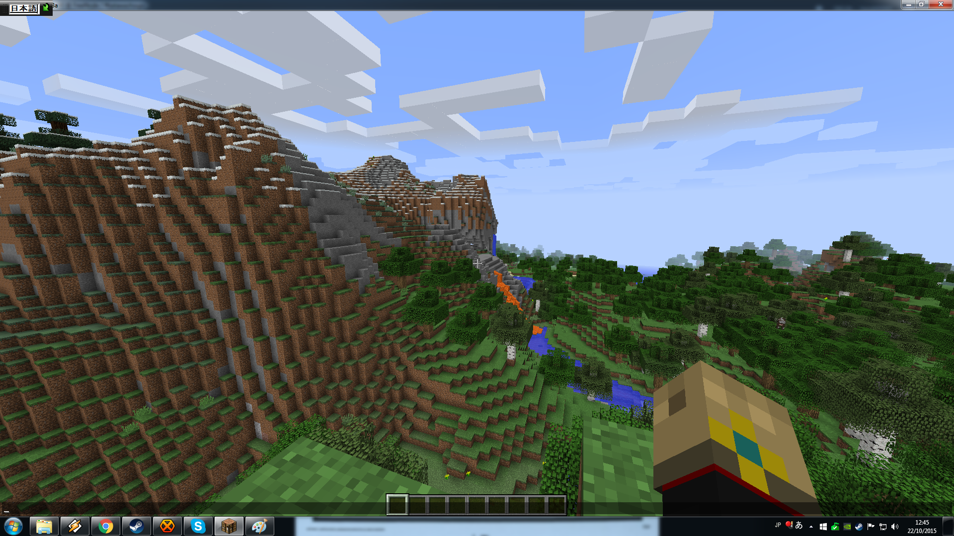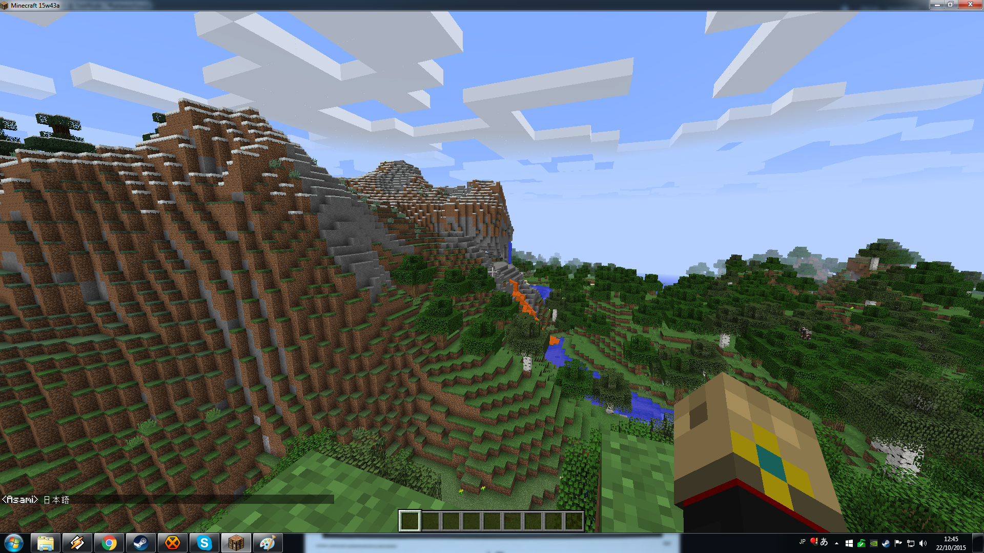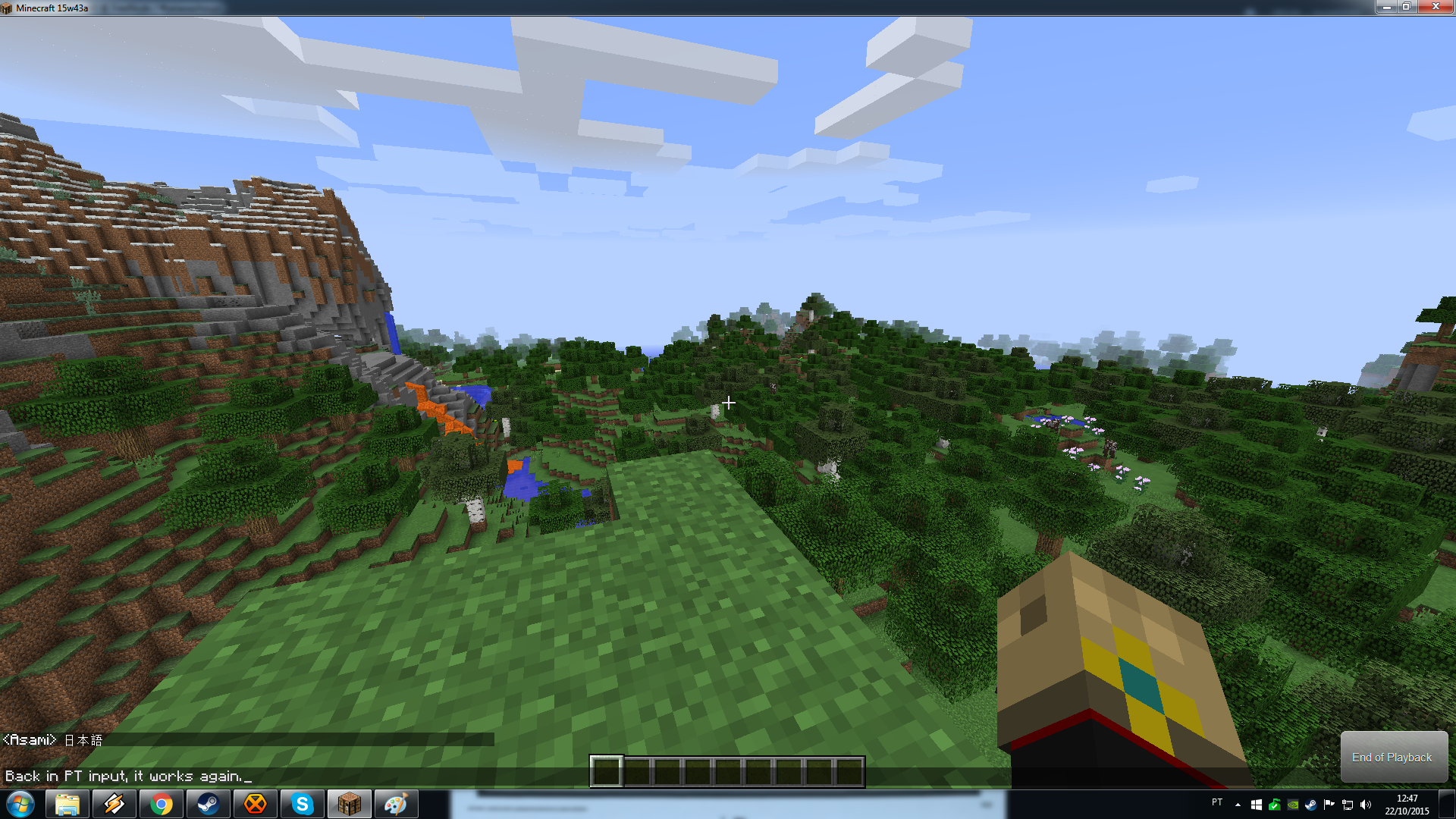 I decided to test out the finally fixed japanese text input. Opened the game in a normal world, MC in windowed mode. Hit T, the chatbox comes up as normal. I use the mouse, which is now free, to change the input language of Windows from Pt-ABNT2 (I am brazilian with an ABNT2 keyboard) to Jp.