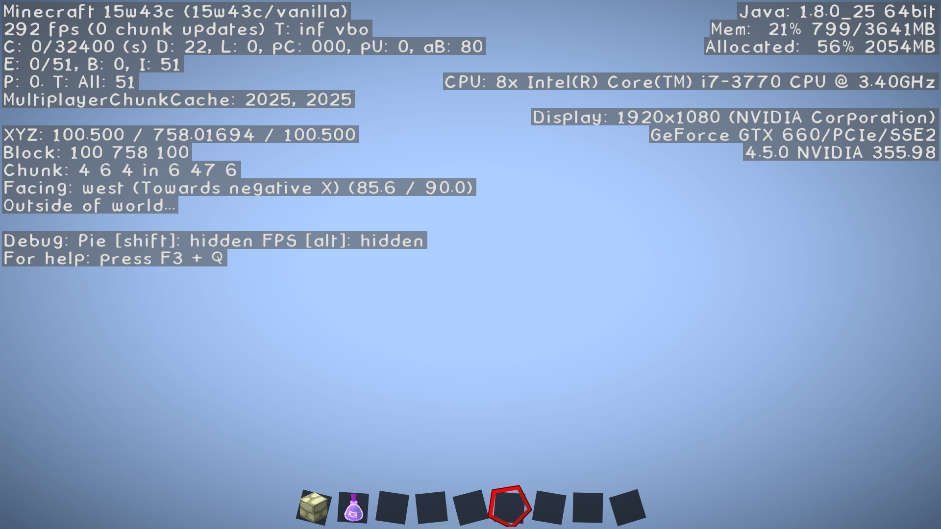 When you go over Y: 254~, the player turns black, and then at Y: 265~, the player vanishes altogether unless you look down. The angle at which you need to regain sight of the blacked-out player vaires according to hight, and you cannot see the player when looking straight down Y: 748~