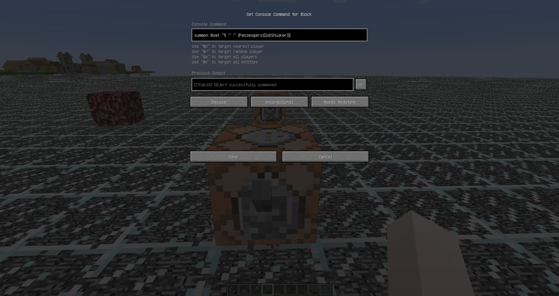 Note: Client-side the shulker will still appear for some ticks in the ground. This happens because the boat sets offsets the y position of the shulker by -0.1, as the shulker has no y offset (see MC-90084). This means its y value will be .9 of the block below.