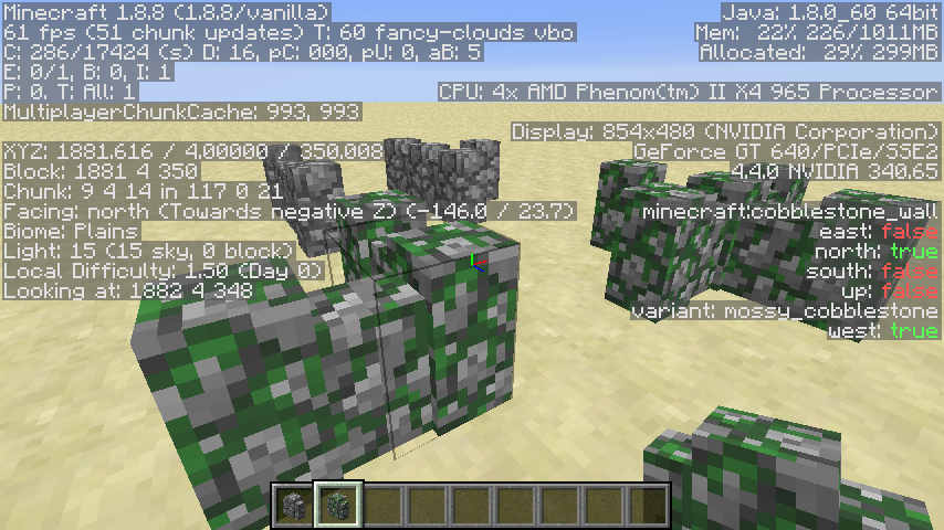 Any cobblestone wall (or mossy variant) will incorrectly detect a block above it ("up: true") except where west+east OR north+south are actually true.
