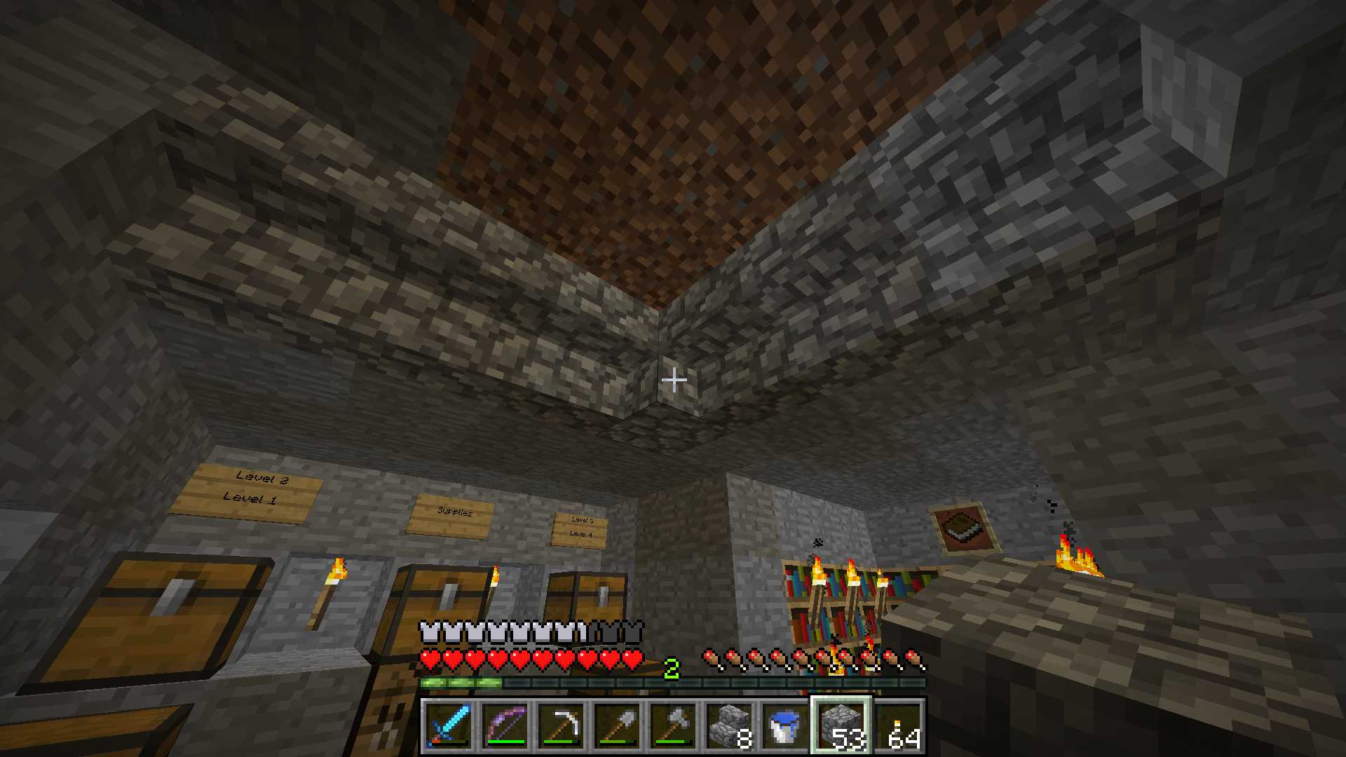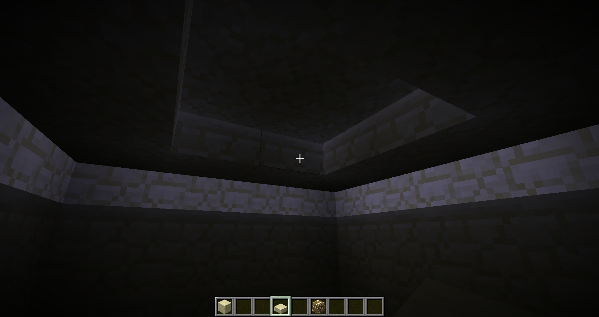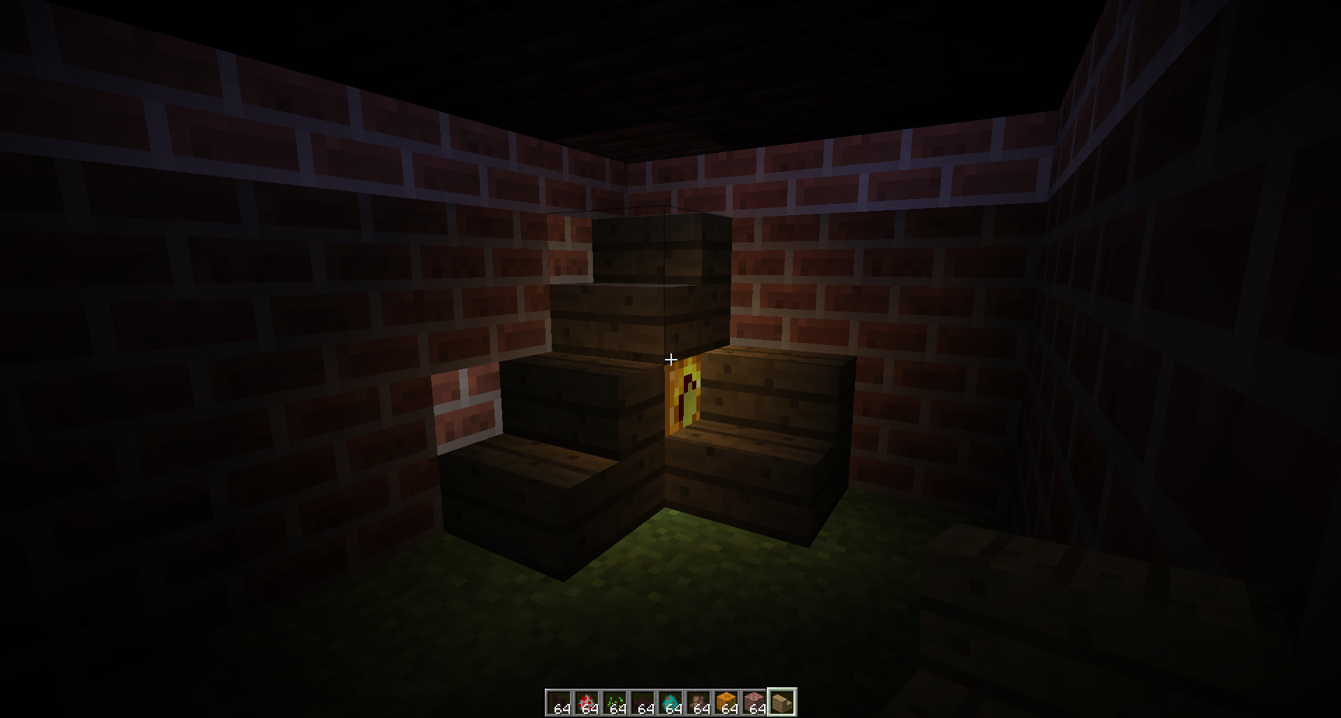 Removing the pumpkin, you can see that light bleeds through a ceiling of half slabs to leave the top layer bright and the rest of the room in darkness.