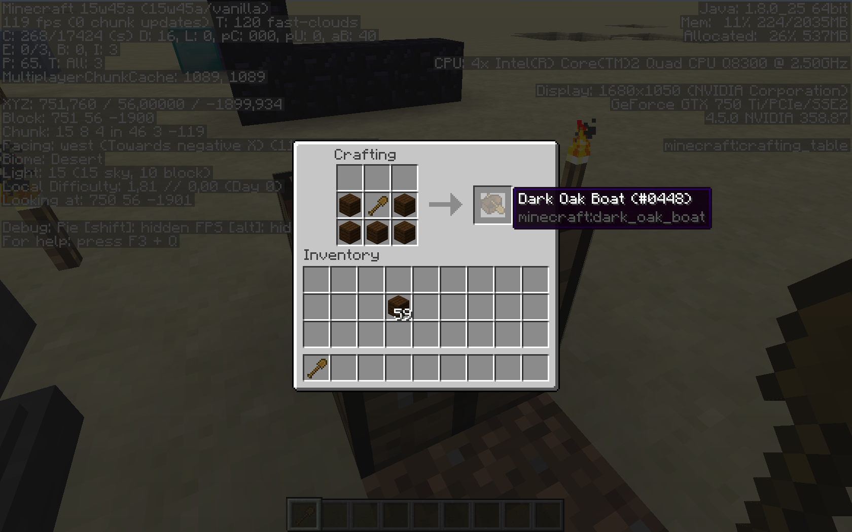 1. Placing 5 planks of Dark Oak in the lower array of the crafting window