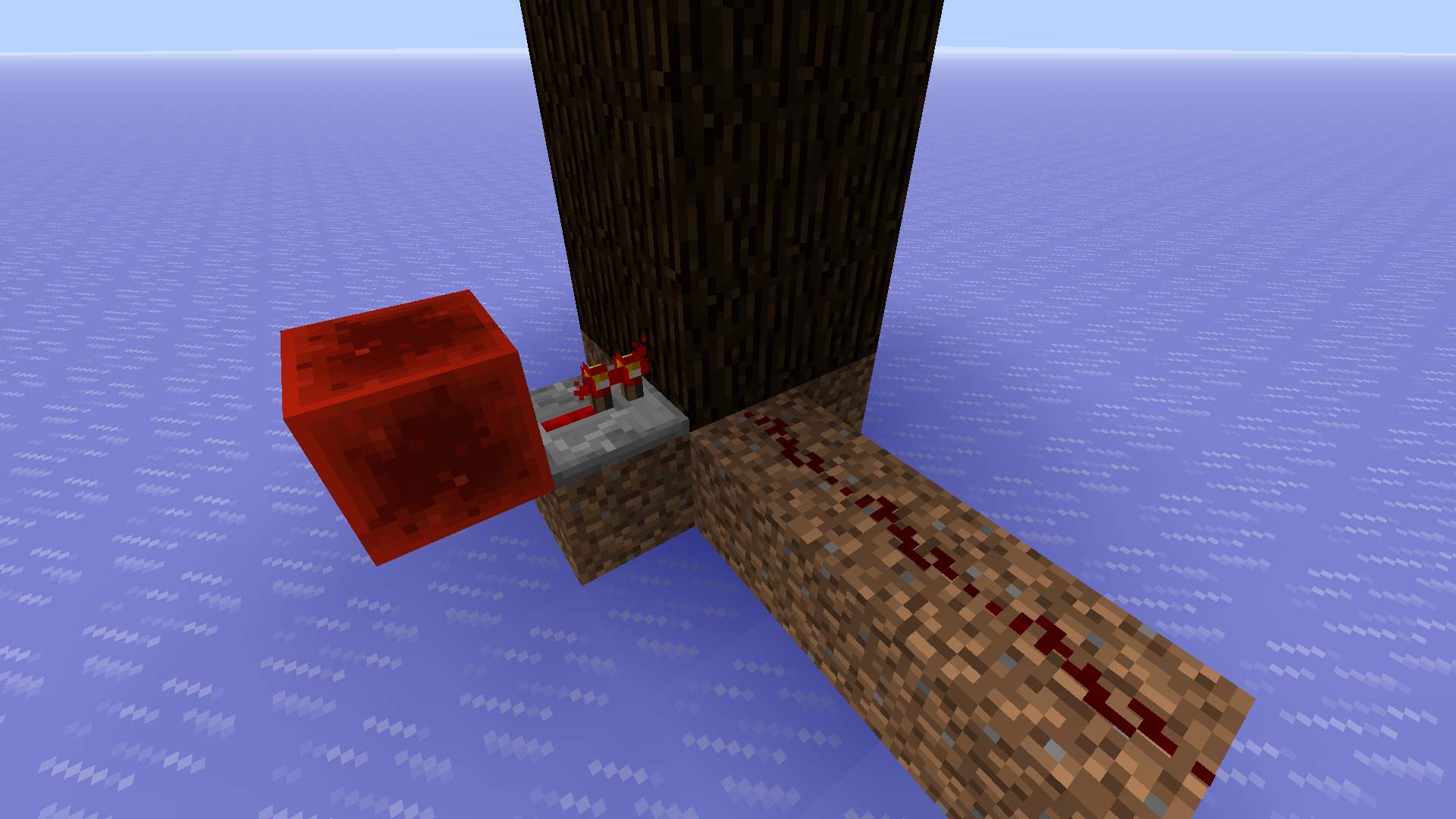 After growing into a 2 × 2 spruce tree, the generated leaves and logs don't interact with redstone components or update surrounding blocks.