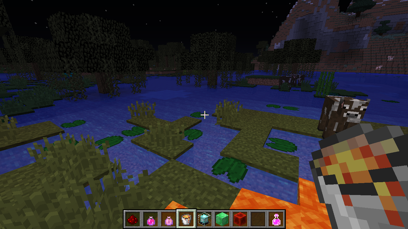 After I placed lava down, I experienced a lag spike and I observed several cows glowing, I keep trying to duplicate this glitch, but it was unpredictable, it only happened after the lava was placed. It only happened for some mobs at specific distances though. All mobs in the vicinity were observed to glow, blazes however, have more of an outline, but never became transparent. It usually occurred near the edges of the screen.