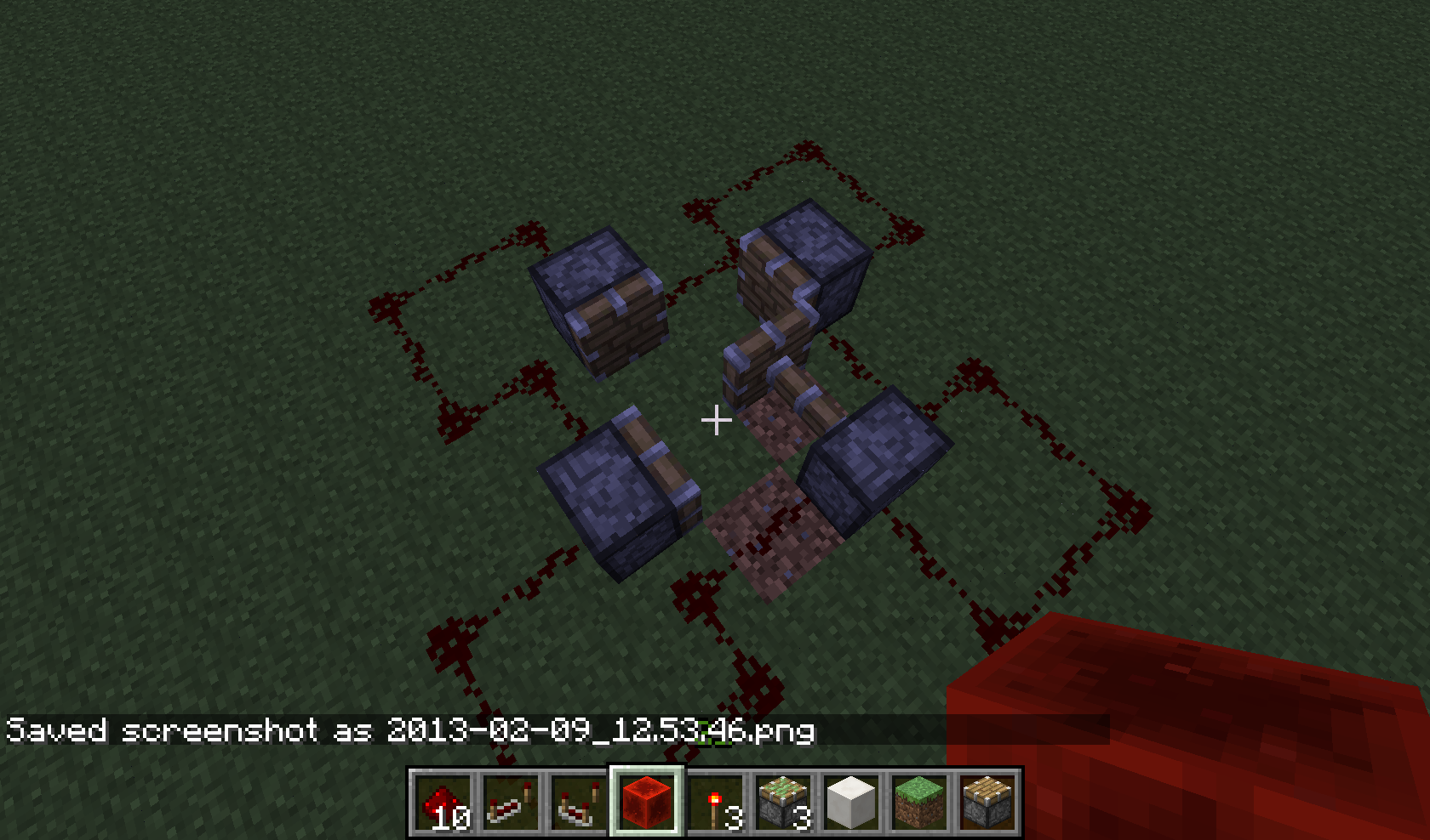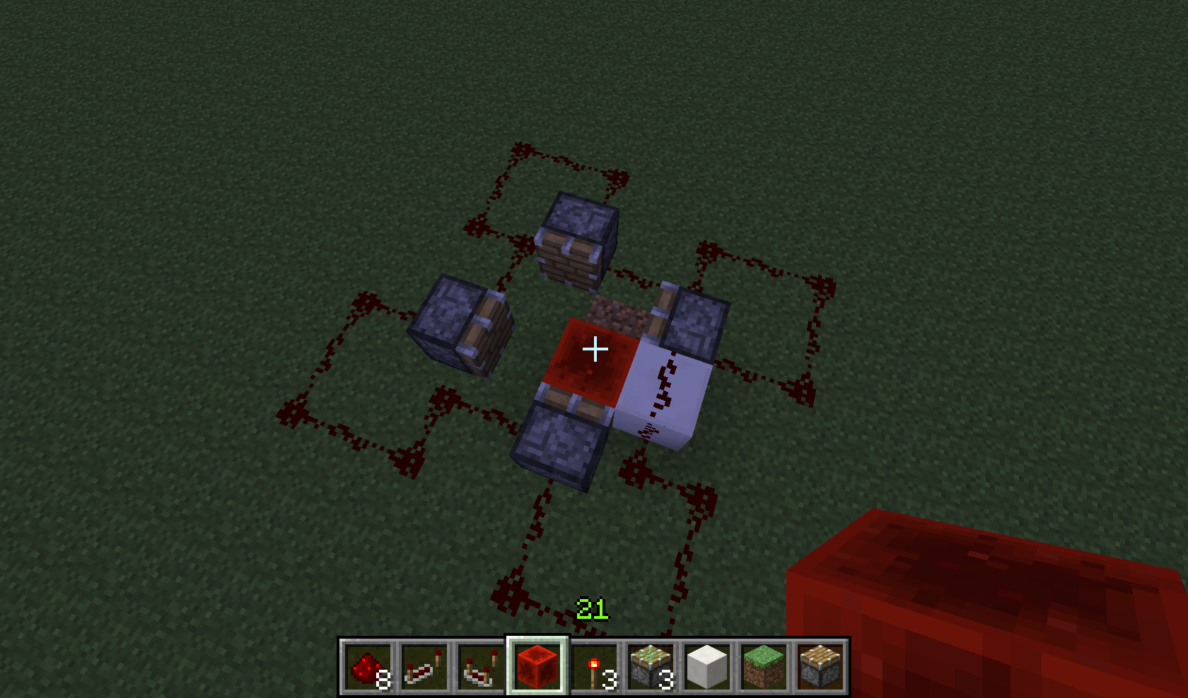 other notable bugs: when you wouldnt use this quartz block and would keep the wires on 1 layer the redstoneblock will be moving around in circles(as expected) but the wires wont be powered, while without the wires it wont move around(or atleast it didnt when i tried). Even more strange is that when i make a screenshot while the redstone block is moving around, it disappears aswell(this is with the redstone wire on the same level, as shown in my last screenshot, after this screenshot the redstone block had disappeared aswell)