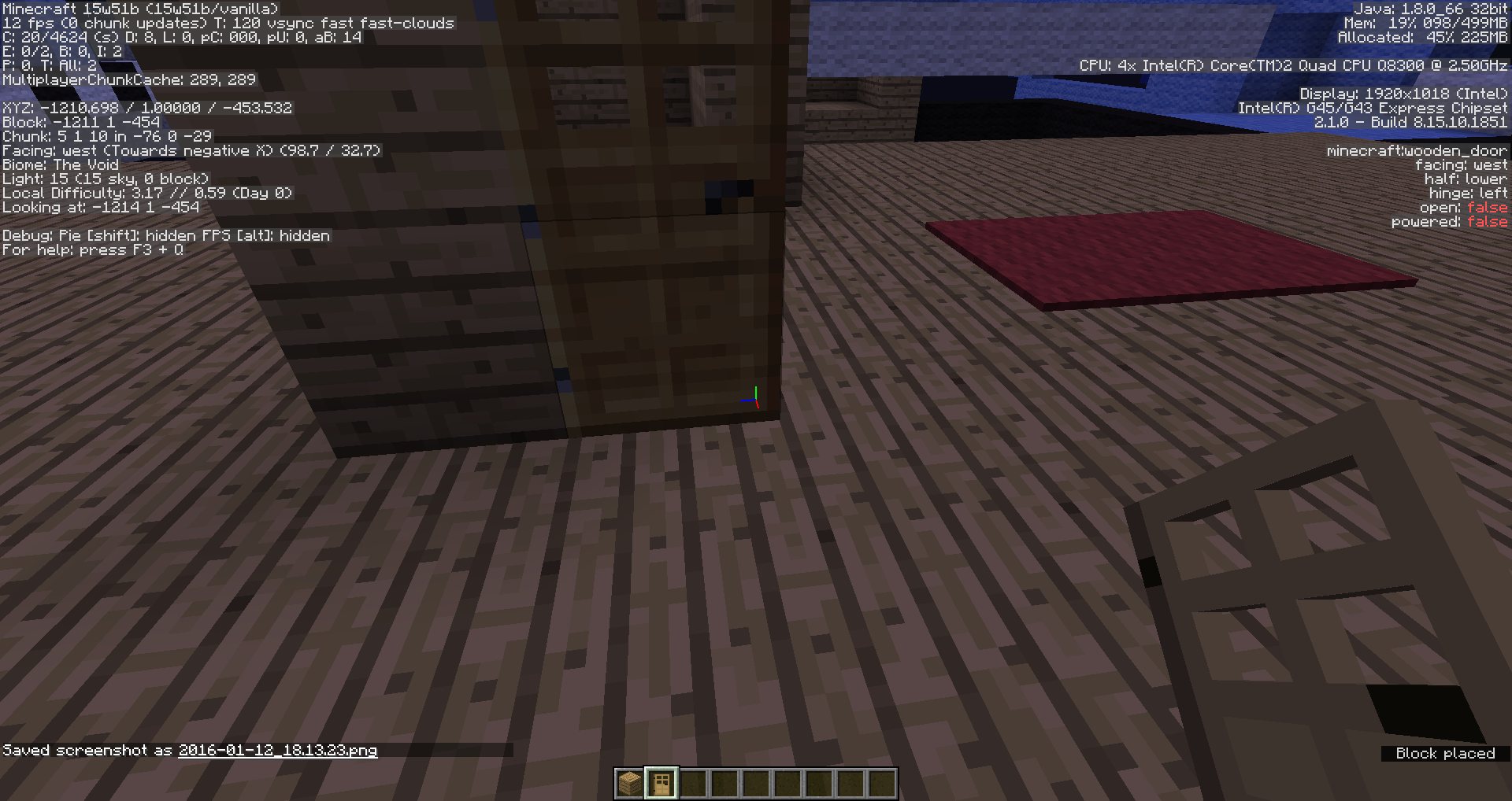 Example: If you place a door by blocks on its right side and click on the left half of the block under the door, the hinge does not line up with the left half of the block and instead, the hinge is on the right side, next to the blocks on the side of the door. The same happens vice versa.