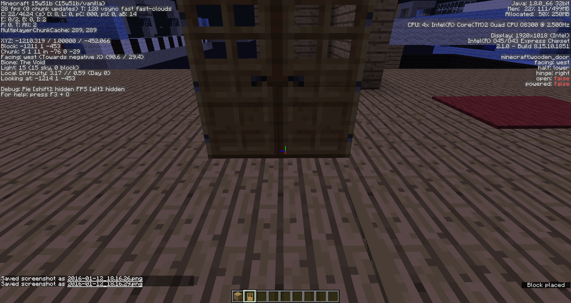 Example: If you place a row of consecutive doors next to one another, the hinges will not line up with the half of the block you clicked on. This only happens when the half of the block you clicked on is next to the handle of the neighboring door.